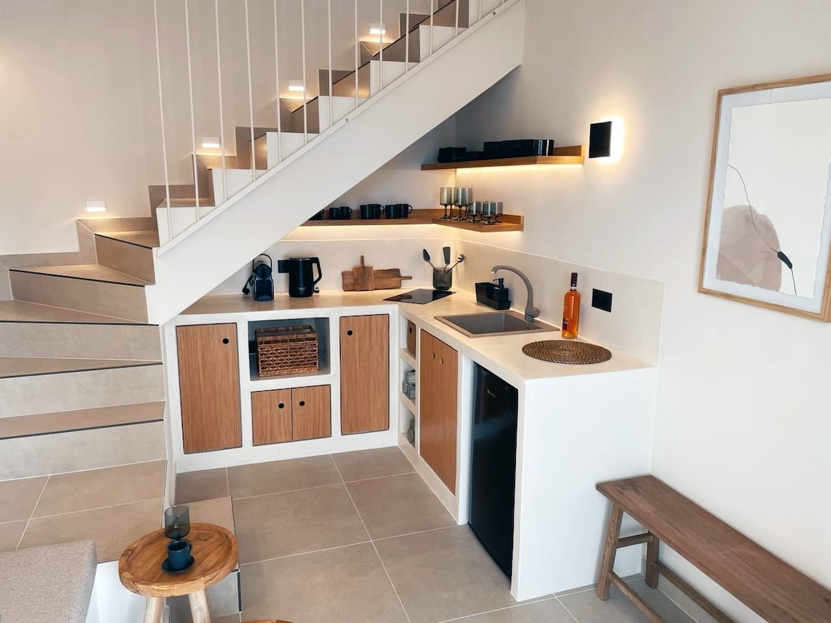 Villa#2 comes in 2 level floors and accommodates up to 6 people. On the ground floor there is a master bedroom, bathroom, fully equipped kitchen, lounge and WC. The upper floor provides 4 single floor mattresses or 2 double ones & its own bathroom. Outdoor private pool with Jacuzzi, patio, dinning area and sun lounges! Welcome drinks, basket of seasonal products, Nespresso coffee, Concierge services, A/C, Netflix, daily housekeeping, laundry services and many more amenities are waiting for you!
