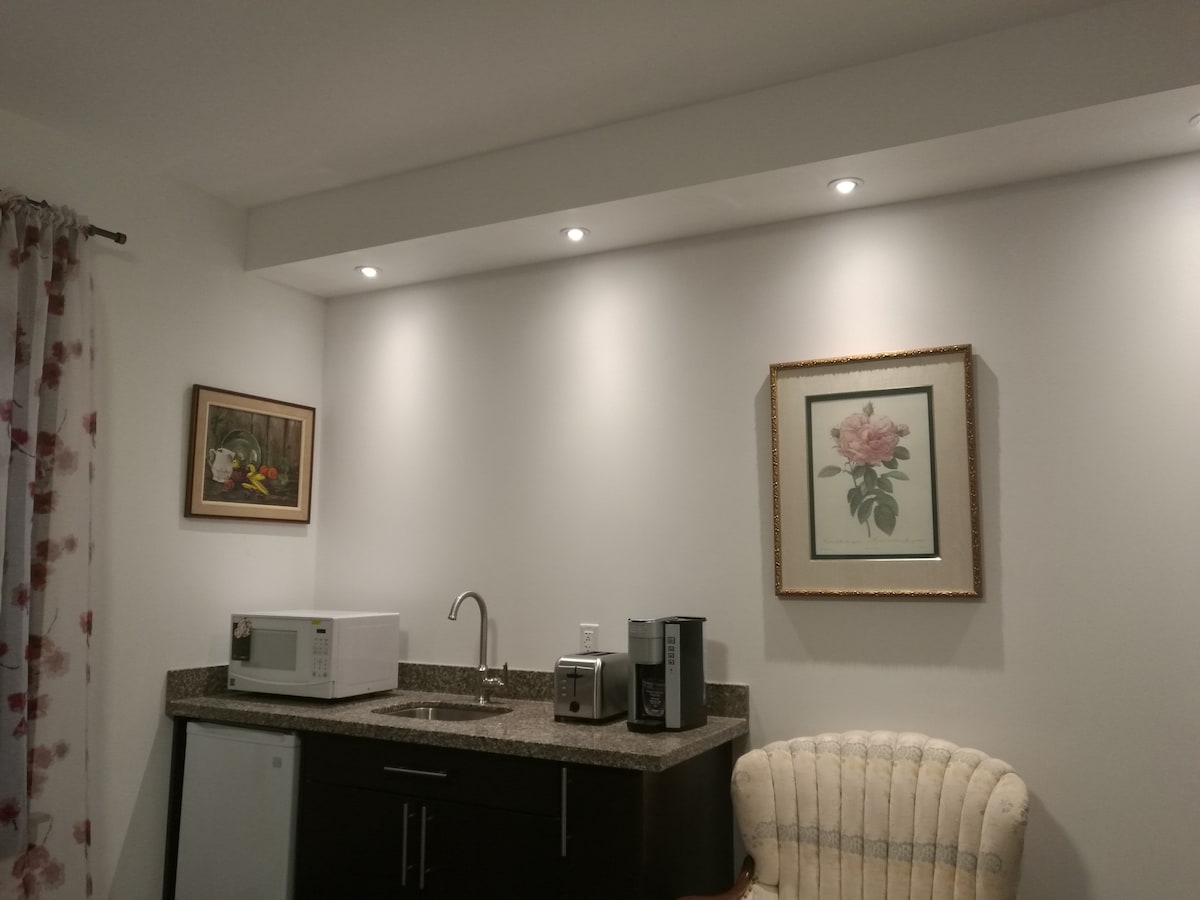 Այս գեղեցիկ տարածքում ձեզ կզգաք ինչպես տանը։ Մեկ մեծ սենյակում կա փոքր խոհանոց (առանց գազօջախի)՝ սառնարանով, միկրոալիքային վառարանով, բարի լվացարանով և Keurig սրճեփով սուրճի կամ թեյի համար, պաբի բարձրությամբ սեղան՝ 4 անձի համար նստատեղերով, հանգստի սենյակ՝ էլեկտրական բուխարիով, մեծ հեռուստացույց՝ մալուխային հեռուստատեսությամբ, Netflix-ով, Prime Video-ով, նոր բազմոց՝ շեզլոնգով և թեքվող նստատեղերով, ինչպես նաև գրասեղան։ Վայելեք առանձին ննջասենյակը, որտեղ կա queen-size չափսի մահճակալ, գրասեղան, կոմոդ և պահարան, կաբելային հեռուստատեսություն։ Առանձին լոգասենյակում կա երկտեղանի լվացարան, զուգարան և ցնցուղ։