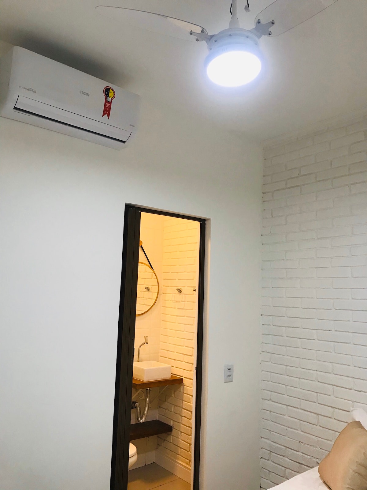 Nessa suíte privativa você terá frigobar, microondas, TV Samsung Plus, ar condicionado e ventilador. O banheiro é privativo.