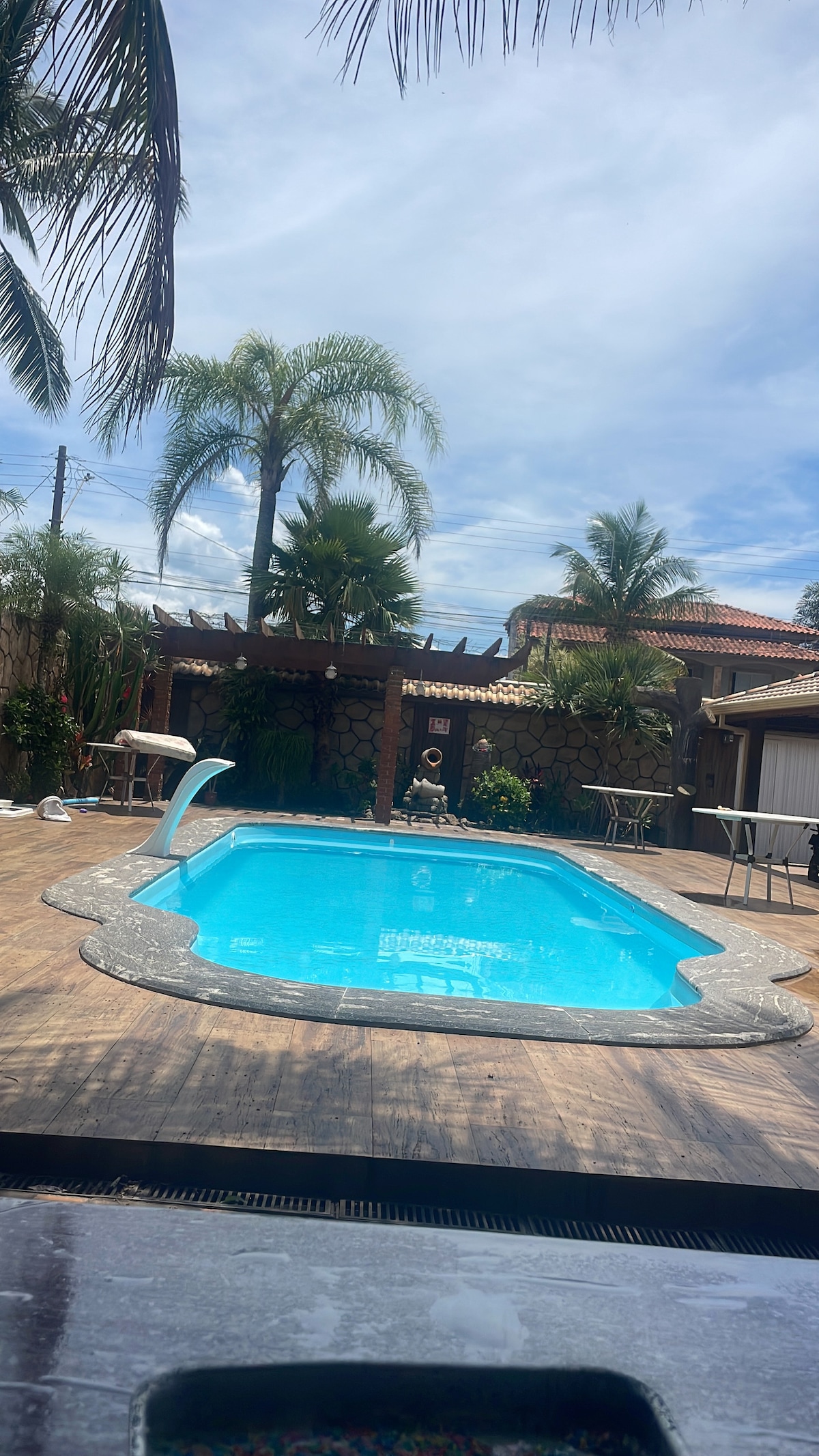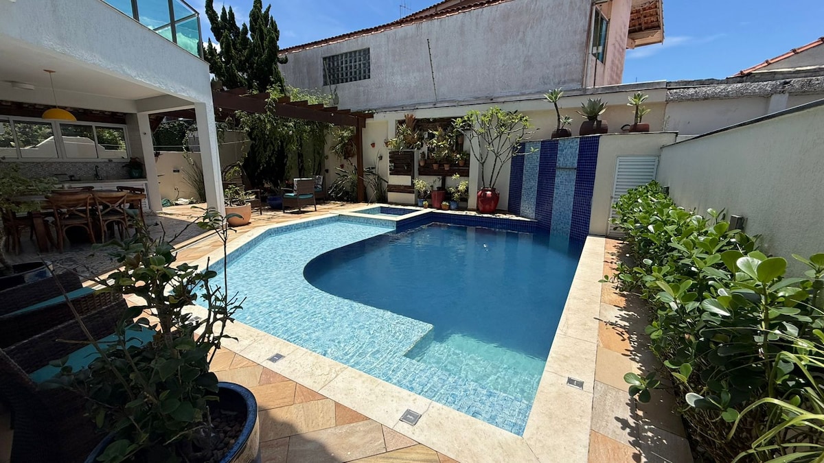 Antes de mais nada, um Aviso: se está buscando um local para festas ou para uso de som alto, ainda que durante o dia, esta não é a casa ideal. Este ótimo lugar com muito espaço para se divertir. Ampla piscina com rede de segurança para crianças e pets. Churrasqueira, piscina e cozinha. 4 quartos suítes com ar condicionado sendo um no andar térreo, ideal para idosos. Mais um quarto com ventilador e banheiro social. Privacidade e conforto. Garagem p/ até 4 carros. A 500mts da praia.