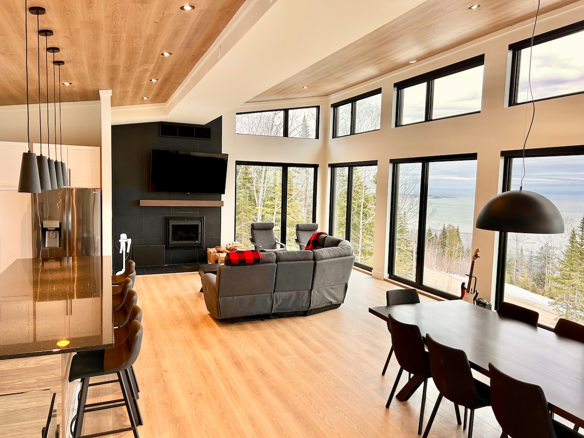 The St. Lawrence stretches out before you, golden in the morning light. This private triplex in Charlevoix spans two floors with floor-to-ceiling views, a sunny terrace, full kitchen, and a mezzanine loft for quiet mornings or remote work. A private entrance, two parking spots, and an EV charger make arrival effortless. After a day hiking or exploring Baie-Saint-Paul, the view brings you back every time. Let the river do the rest. Check your dates! We'd love to host you!