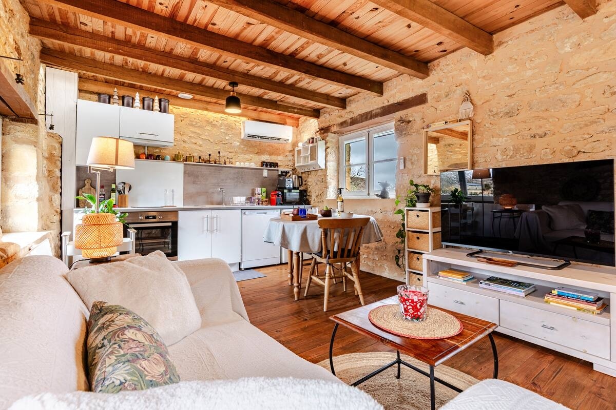 Եկեք և լիցքավորեք ձեր մարտկոցները բնական միջավայրում: Իդեալում գտնվում է Vézère հովտի սրտում, 5 կմ հեռավորության վրա Eyzies, մայրաքաղաք Prehistory, միջեւ Montignac - Lascaux եւ նրա միջազգային կենտրոն պատի արվեստի, եւ Sarlat, միջնադարյան քաղաքը, քաղաքը արվեստի եւ պատմության, մեր ֆերմա Périgourdine կառաջարկի ձեզ բոլոր հարմարավետության եւ հանգստության. Բաղկացած է ընդարձակ հյուրասենյակից (Wi - Fi, հեռուստացույց), խոհանոցից, ննջասենյակից (երկտեղանի մահճակալ) և ցնցուղասենյակից ։ Օրն ավարտեք փայտի այրման բուխարու մոտ ։ (անվճար)