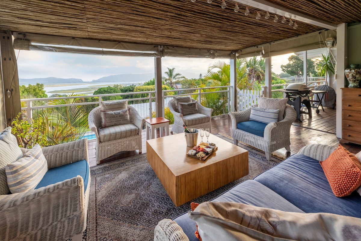 180 degree views (Solar for power security) of the stunning Knysna lagoon in in quiet neighbourhood. Top finishes in a new house! Lovely garden and pool. Sunny deck to enjoy the views and a Fireplace to add atmosphere and warmth on cooler evenings. So close to town but quiet and private. Braai/Barbecue for outdoor cooking and dining on the many beautiful evenings. The reviews from all our guests say it all and 75% of our guests are discerning international travellers.