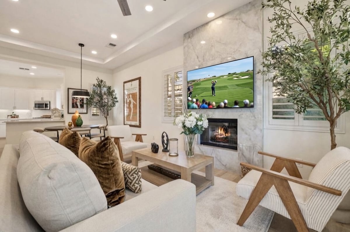 The Legacy Palms is a newly renovated, spacious & bright 2 bedroom, 2 bath condo with a modern California-desert vibe. French doors open to a large private balcony with dining and sitting area, overlooking the lush villa grounds & water fountains. It features a full kitchen with new stainless steel appliances, 3 smart TV's, dining area, 2 fireplaces and pull out queen sleeper couch in the living area. The community grounds feature 12 heated pools and spas, a gym, hammocks, grills and more!