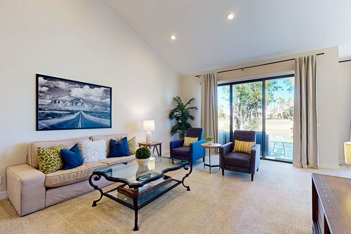 Գեղեցիկ ձևավորված և լավ նշանակված մեկ հարկանի Պալմ Դեսերտ թաունհաուս ՝ ավտոմայրուղու, Լա Կինտայի, Ռանչո Միրաժի և Ինդիան Ուելսի մոտ, 4 մղոն դեպի BNP Paribas Open, իսկ Coachella/Stagecoach երթուղայինը գտնվում է ընդամենը 2 մղոն հեռավորության վրա ։ Գտնվում է Palm Desert Resort Country Club - ի 5 - րդ և 8 - րդ անցքերի միջև գտնվող շքեղ կանաչ գոտու վրա ՝ լողավազանով և սպա կենտրոնով ։ Հարմար է ամեն ինչի համար ։