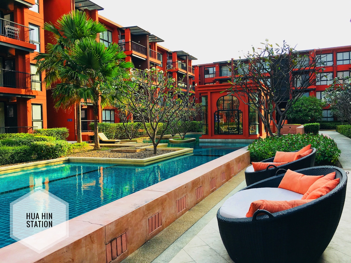 *LOW RISE, not affected by earthquake • Luxury & very comfy sleep with Omazz mattress • Quiet & private • Free 1 car parking • Beautiful pool & Gym • Near Beach & Night market Resort Condo, BEST LOCATION IN THE HEART OF HUAHIN!! Next level of urban living awaits, luxurious modern coastal condo .You have access to city-center amenities, such as the restaurants, shopping malls and a sandy tropical beach. Large & specious place can fit up to 2 prs(35 sqm)