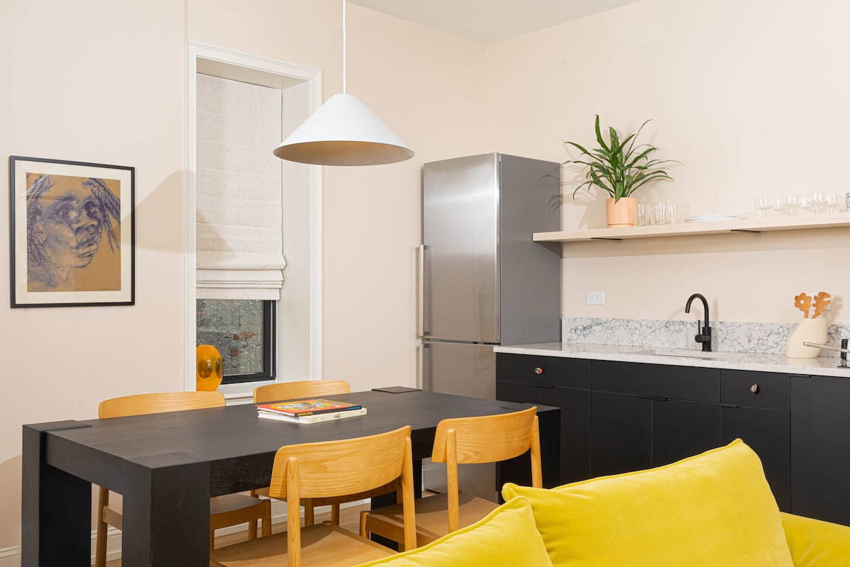 The Grand King Suite has a generous living room, custom dining table and banquette with full kitchen outfitted with everything you need. The corner king bedroom is light-filled and airy with the adjacent spa-like bathroom featuring a rain shower and bath amenities by Aesop. Pets welcome ($100 per pet) Twin sized cot available upon request ($25 per night).