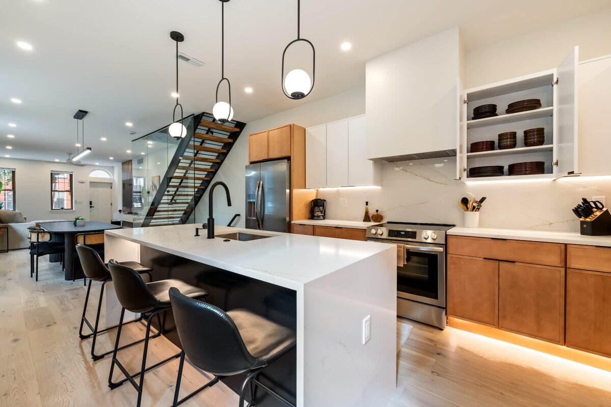 Այս մաքուր, մինիմալիստական տունը կատարյալ վայր է Ֆիլադելֆիայում գտնվելու ընթացքում մնալու և հանգստանալու համար ։ Այն ունի տանիքի տախտակամած, որտեղից հիասքանչ տեսարան է բացվում դեպի քաղաքը ։ Այլ հարմարություններ են մարզասրահը, պատշգամբով գրասենյակային տարածքը, հետնաբակը և տան յուրաքանչյուր հեռուստացույցին միացված AppleTV - ները ։ Դուք մոտ եք կենտրոնական Ֆիլլիին, բայց բավականաչափ հեռու եք հանգիստ ժամանակ անցկացնելու համար, եթե դրա կարիքն ունեք ։ Հիանալի ռեստորանները, բարերը և հեծանվավազքը գտնվում են ընդամենը մի քանի թաղամաս հեռավորության վրա ։
