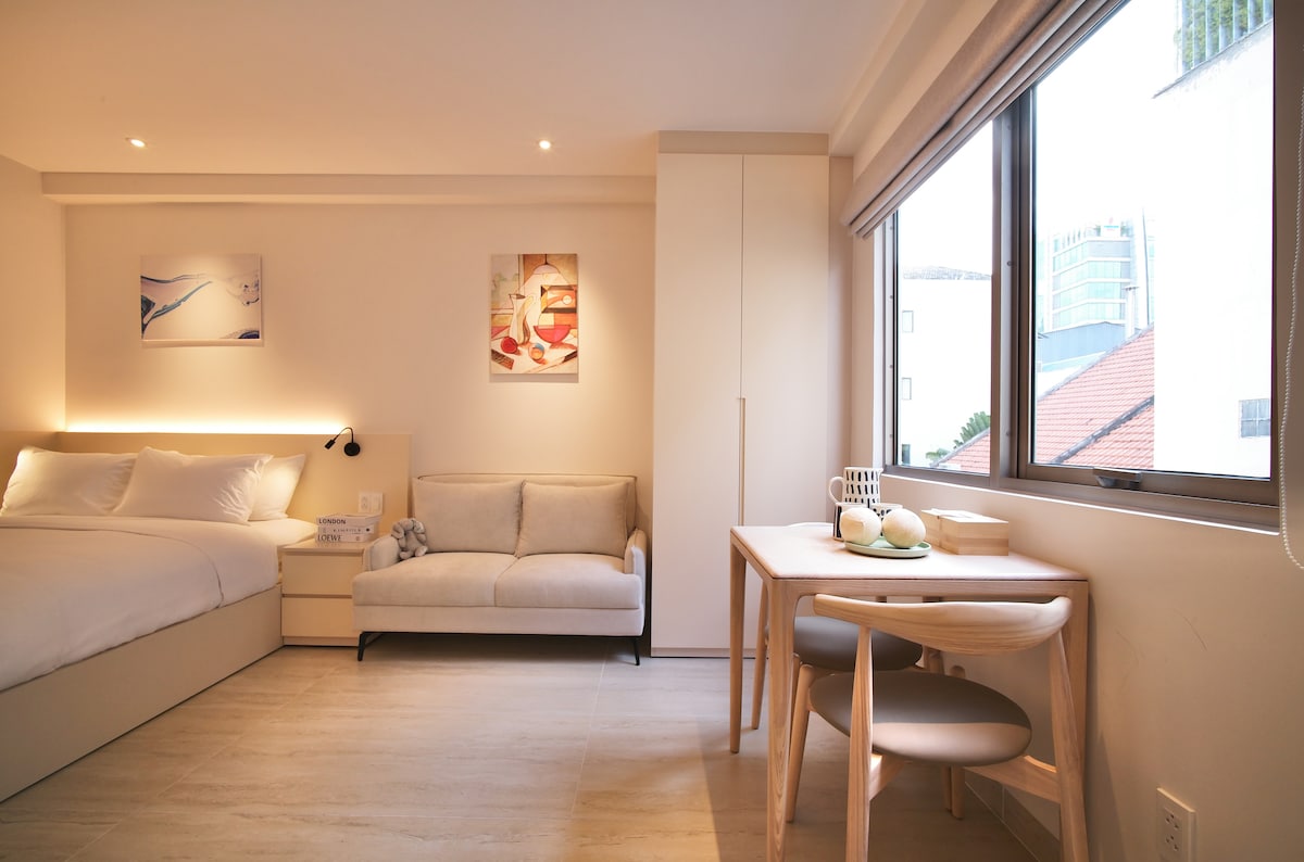 Located on Nguyen Son Ha St, a peaceful hidden gem tucked between the vibrant Cao Thang and Vo Van Tan streets. -The Space: Two large windows with amazing natural light. Stylish, airy, and a peaceful retreat from the city buzz. -The Location: 1-3min walk to Saigon’s best local eateries, chic cafes, and convenience stores. -The Vibe: Live like a local with District 1 just minutes away. Fast Wi-Fi | Elevator |Washing Machine & Dryer | Central Location