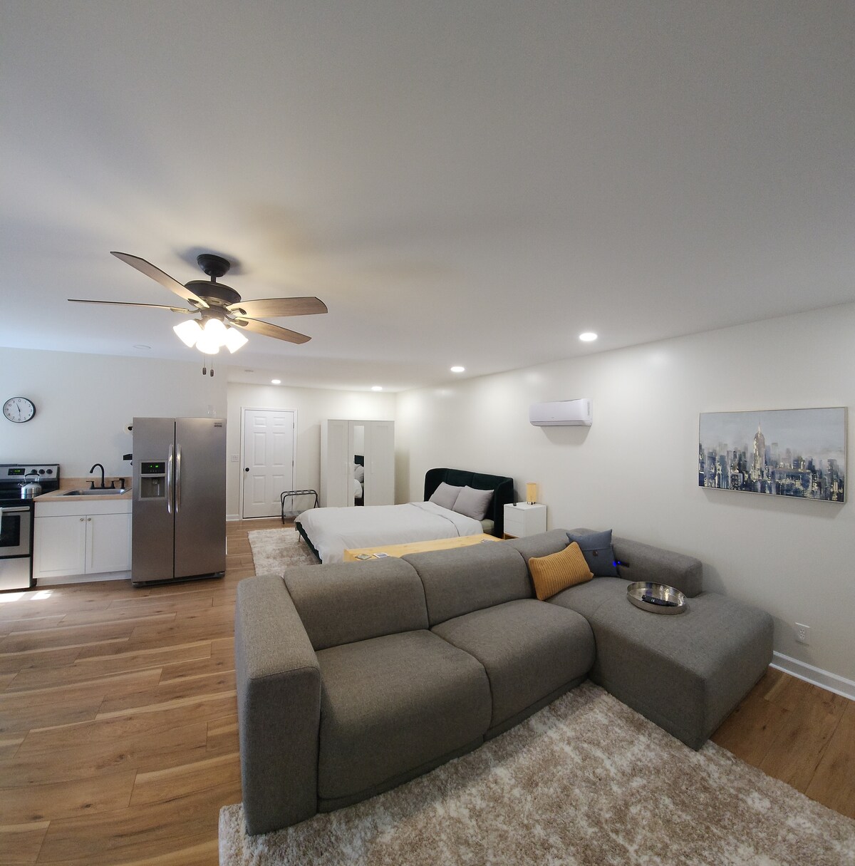 Relax in this clean, comfortable guest suite featuring a cozy bedroom, bright kitchenette, and private bathroom. Start your day with a fresh cup of coffee or unwind by the fire pit, surrounded by peaceful woods and quiet nature views. This private space is perfect for solo travelers or couples looking for a calm, convenient Greenville stay with all the essentials.