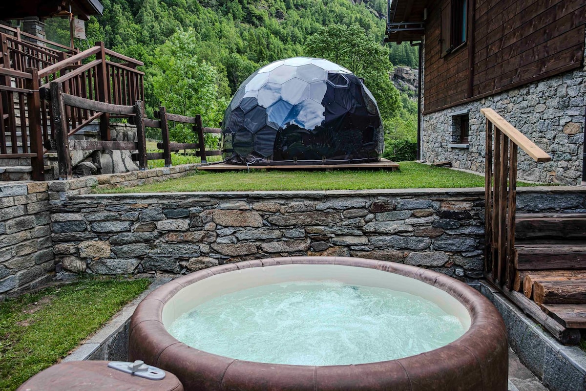 La sfera geodetica nel mezzo di un bosco con una vista mozzafiato e la vasca Idromassaggio esterna ad uso esclusivo. La sfera è dotata di un letto matrimoniale, un'area relax dove poter gustare in pace una tazza di caffè o tè.Lontani dal turismo di massa in contatto diretto con la natura senza dover rinunciare il comfort.Le sfere sorgono in prossimità di un casale ottocentesco dove sono posizionati anche i bagni, nel mezzo di un bosco di 10ha con le varie aree relax e angoli meravigliosi.