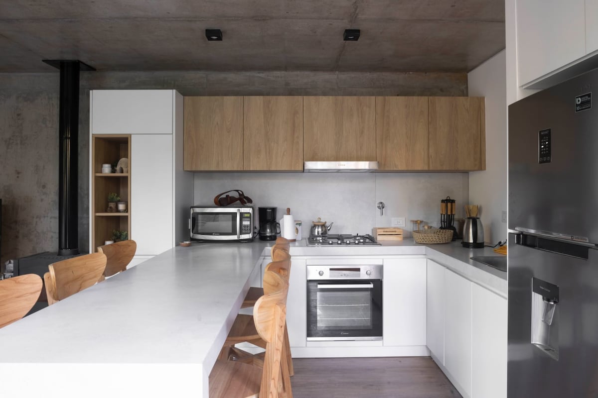 Increíble Micro Casa de Concreto en pleno bosque, respetando la naturaleza del lugar, únicoambiente con una cama queen, mesa escritorio, 2 sillas y WiFi. Baño con ducha, lavamanos, inodoro. Kitchenette con bacha, pava eléctrica, microondas y heladera con freezer, NO está para cocinar. Muy iluminada con el mar a 700m y el centro comercial a 600m. Esta hermosa casa está escondida detrás de la casa principal con total privacidad y autonomía. Asador exterior para uso común del lugar. Bienvenidos!