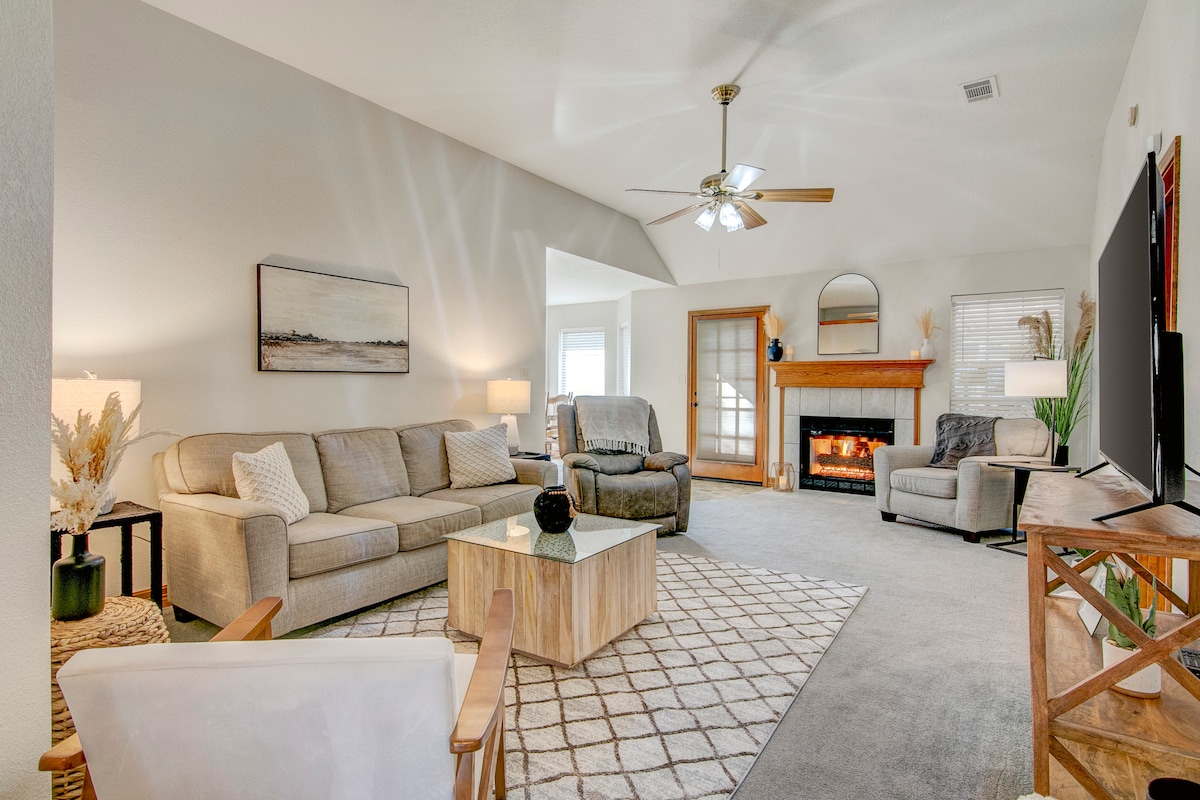This beautiful 3-bedroom home boasts 2 full bathrooms, a spacious 2-car garage and accommodates up to 8 guests. The living room features high vaulted ceilings complemented by a cozy gas fireplace, while the serene backyard patio offers a comfortable sectional, a gas fire pit, a BBQ grill, and a large TV. Ideal for families and professionals seeking a more comfortable and spacious alternative to a hotel room, and conveniently located just minutes away from major stores, restaurants and hospitals.