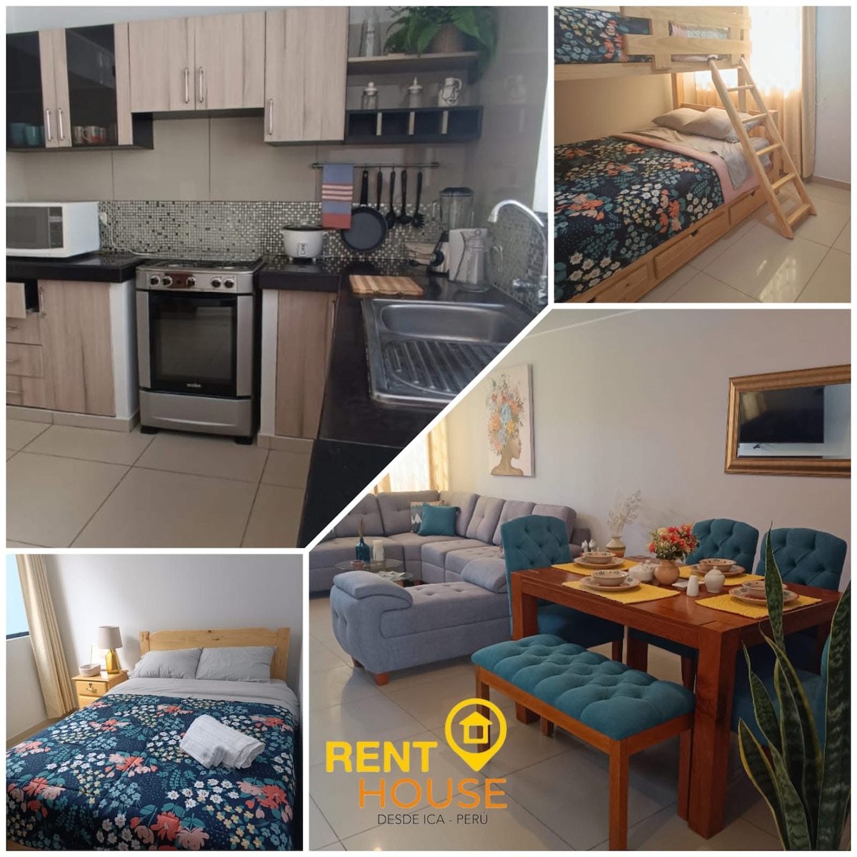 Bienvenidos a nuestra acogedora casa de huéspedes en Ica, diseñada para brindarte tranquilidad, comodidad y una experiencia inolvidable. El espacio combina modernidad y calidez, ideal para familias pequeñas, parejas o grupos de amigos que desean disfrutar de Ica. 🛋 Sala cómoda y luminosa Perfecta para descansar. 🍽 Comedor acogedor Ideal para compartir. 🍳 Cocina totalmente equipada con electrodomésticos. 🛏 Habitación Principal + Habitación con camarote 🛁 Baño privado completo