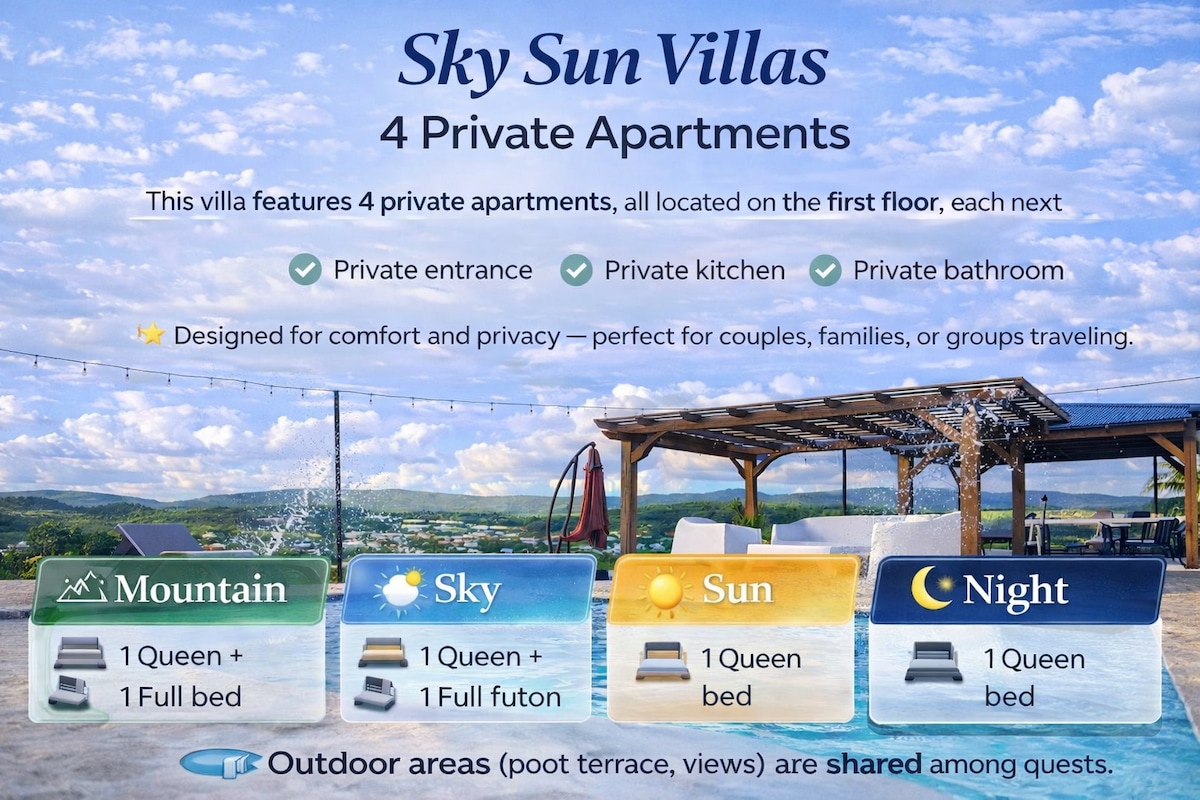 Sky Sun Villas-ը ողջունում է ձեզ ձեր մասնավոր հանգստի վայրում։ Ներս մտնելուն պես դուք կհանգստանաք և իսկապես կվայելեք ձեր հանգիստը։ Ձեր վիլլայում կա սրճեփ, սառնարան, լիովին կահավորված խոհանոց, պահարաններ, սպասք, գեղեցիկ լոգասենյակ, հեռուստացույց՝ Netflix-ով, և այն ամենը, ինչ հարկավոր է հարմարավետության և հարմարավետության համար։ Մեր գեղեցիկ կղզու, լողափի, լճի և հեռվում գտնվող Էլ Յունկեի անզուգական տեսարաններ։ Օրը լողավազանում լողալով, արևի տակ պառկելով կամ հանգիստ մթնոլորտում անցկացրեք։