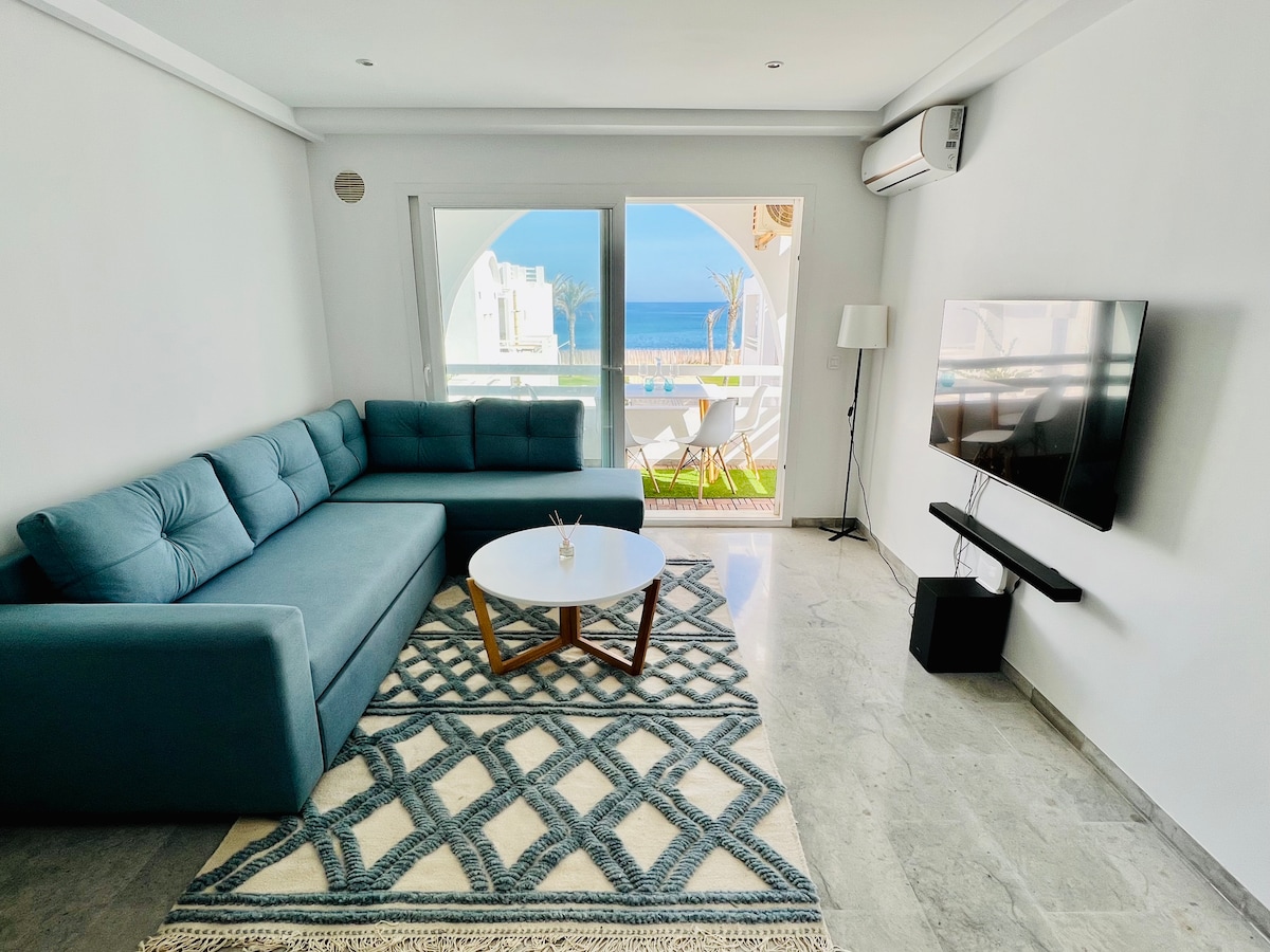 Stunning apartment with panoramic sea views in Chott-Mariem, in a peaceful and secure residence with pool and direct beach access. 🌊 Bright, modern and fully equipped — perfect for couples, families (baby friendly), friends and remote workers. Fast WiFi, secure parking, shops nearby. For an even more fun stay: volleyball, beach tennis, masks & snorkels available on request 🎾🌊 A relaxing setting by the sea for a truly unforgettable stay. ☀️