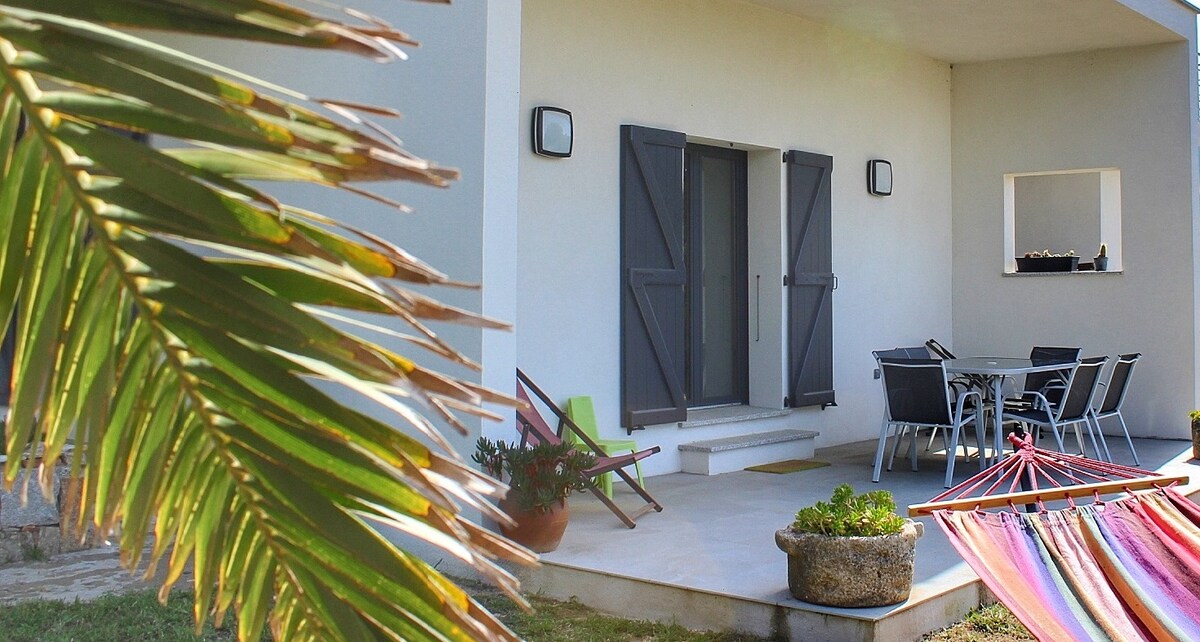 Appartement spacieux de 60m2, dans petite villa attenante à celle des propriétaires. Situé dans une oliveraie d'un hectare, avec vue panoramique sur le Magnifique golfe du Valinco, 10 minutes de la plage la plus proche et 10 minutes du centre-ville de Propiano, grande terrasse de 50m2 vue mer, plage et horizon, seconde terrasse attenante, couverte et abritée . Salon de jardin et parasols, petit jardin fleuri à l'arrière avec salon de jardin parasol et barbecue,