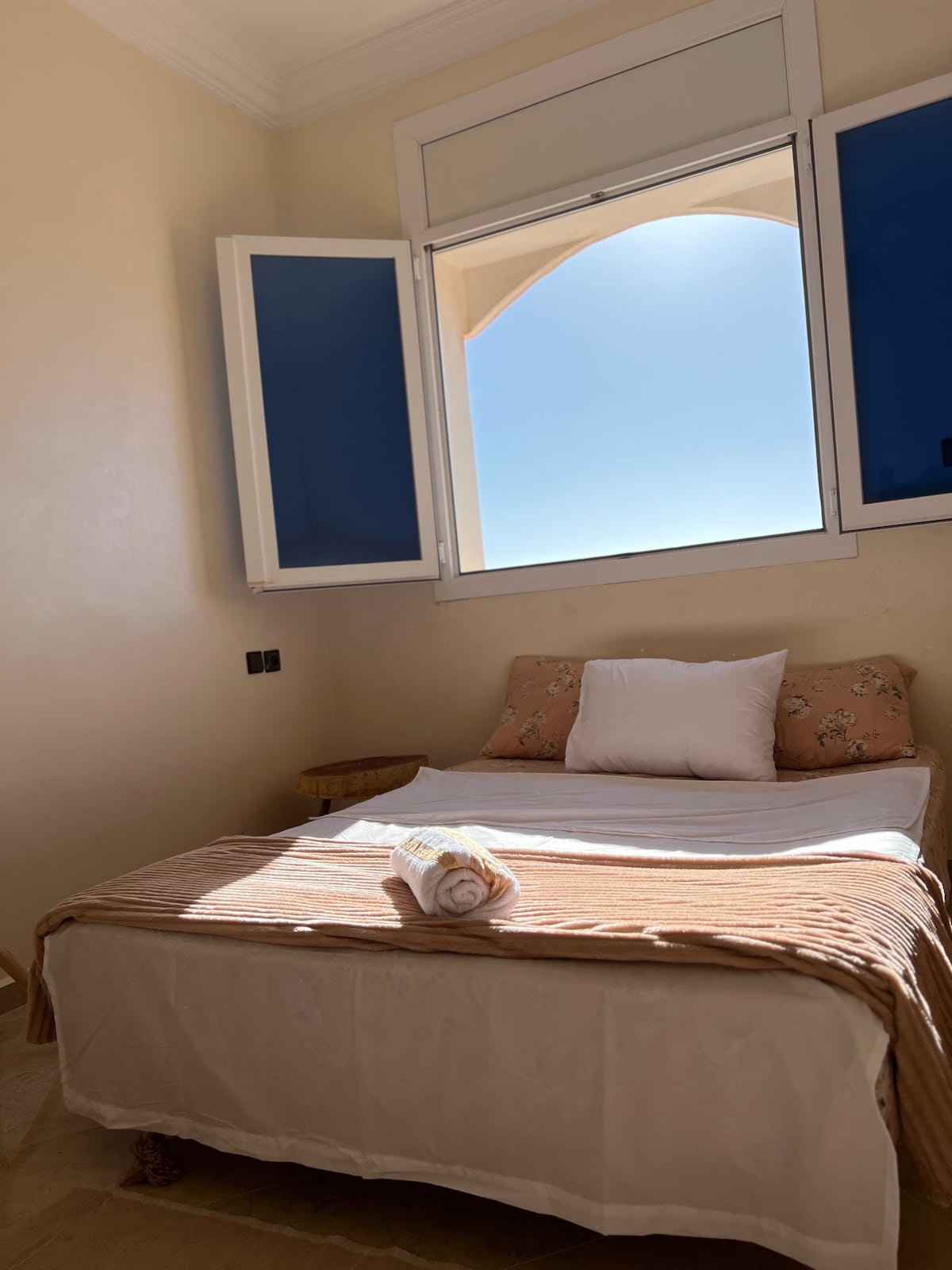 Cozy twin room inspired by the traditional charm of Fez, offering a peaceful and bright space to relax after a surf day. Located on the second floor of Nomazigh Surf House, guests can enjoy access to the chill terrace, co-working area and a rooftop with ocean view. Just a short walk to local bakery (1 min), Happy Tamraght restaurant (2 min), and Manzili Co-working (4 min). Close to popular surf spots like Devil’s Rock and Banana Point.