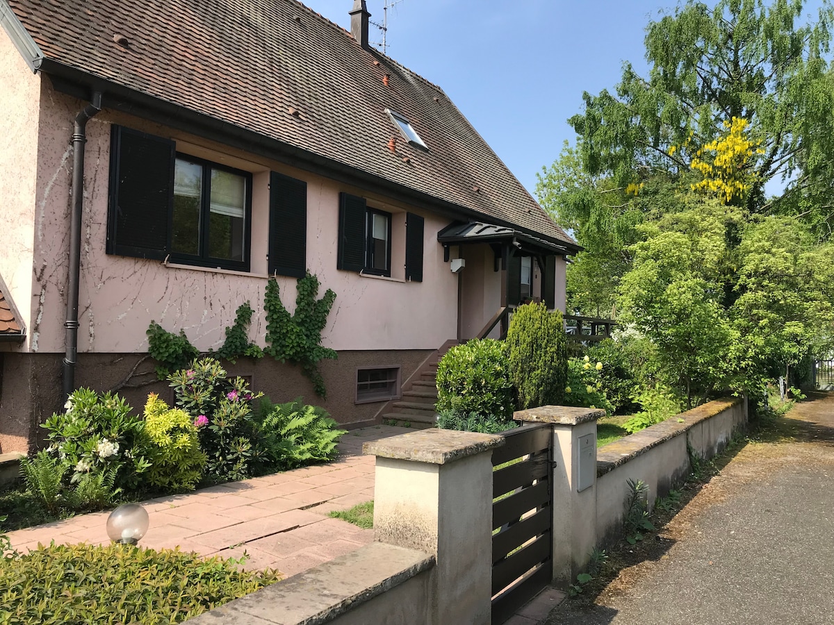 Պայծառ մասնավոր տուն հմայիչ բնակելի տարածքում գտնվող տանը (առկա է անկախ մուտք և կայանատեղի )։ 2 սենյականոց կացարան ՝ գեղեցիկ գլխավոր առանձնաբաժին ՝ մուտքի ցնցուղով և հյուրասենյակով ՝ փոխարկելի բազմոցով, սառնարանով և միկրոալիքային վառարանով ։ Հանգիստ և բնակելի թաղամաս Այն գտնվում է տրամվայի A (Colonne) գծից 6 րոպե հեռավորության վրա, որը տանում է անմիջապես դեպի Ստրասբուրգ քաղաքի կենտրոն և 15 րոպե մեքենայով: Մոտակայքում են նաև Գերմանիան և նրա ամանորյա շուկաները ։