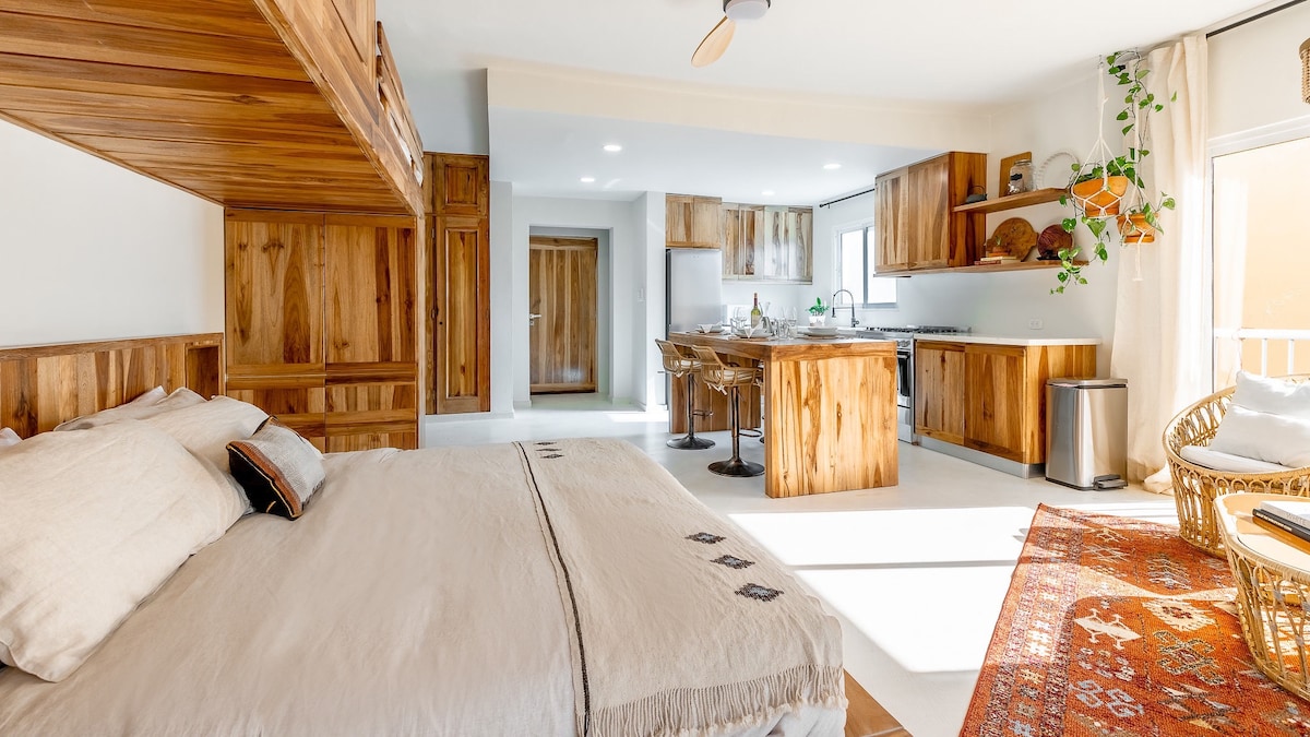 Բարի գալուստ մեր համերաշխ Սուսա, Պուերտա Պլատա ։ Մեր 27 քմ մակերեսով Airbnb - ն միախառնվում է հարմարավետության և ֆունկցիոնալության հետ ։ Բազմակողմանի խոհանոց, բարձր մահճակալ ՝ պահեստով, և երկակի նշանակության պատշգամբ ։ Ոսկու և սև երանգներն ընդգծում են խոհանոցը ՝ հատուկ նախաճաշի բարով: Խելացի հանգույցները, տեղական արվեստը և լողացող դարակաշարային մեդիա կենտրոնը անհատականացված շտրիխներ են հաղորդում ։ Սպիտակ, սև և կանաչ երանգները ստեղծում են ժամանակակից արևադարձային օազիս ։ Սուսայից ձեր փախուստը սկսվում է այստեղից ։