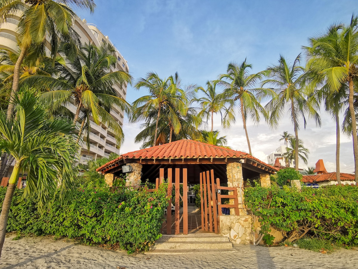 * ¡No hay cobros de manillas! * ¡No gastarás en taxis! Tienes a pocos metros la playa de Bello Horizonte y a unos pasos el C.C Zazúe, tiendas y supermercados. * Aparta estudio con todo lo necesario. * Aire acondicionado solo en la habitación. * Ubicado en segundo piso en edificio viejito y bonito. * Tienes un espacio de parqueadero cubierto. * Piscina con profundidad máxima de 1,20 m