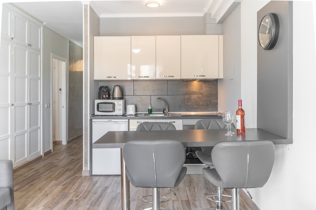 Պայծառ ստուդիա ՝ Կոստա Ադեջեի լավագույն լողափերին շատ մոտ (7 րոպե մեքենայով/20 րոպե ոտքով )։ Դուք կունենաք առանձին տեռաս ՝ արևայրուք ընդունելու կամ ռոմանտիկ ընթրիք վայելելու համար ՝ ծովի վրայով տպավորիչ մայրամուտով: Ամրագրեք ձեր ամսաթվերը հիմա և կվայելեք հանգիստ Կոստա Ադեջեում, որը միշտ կհիշեք:
