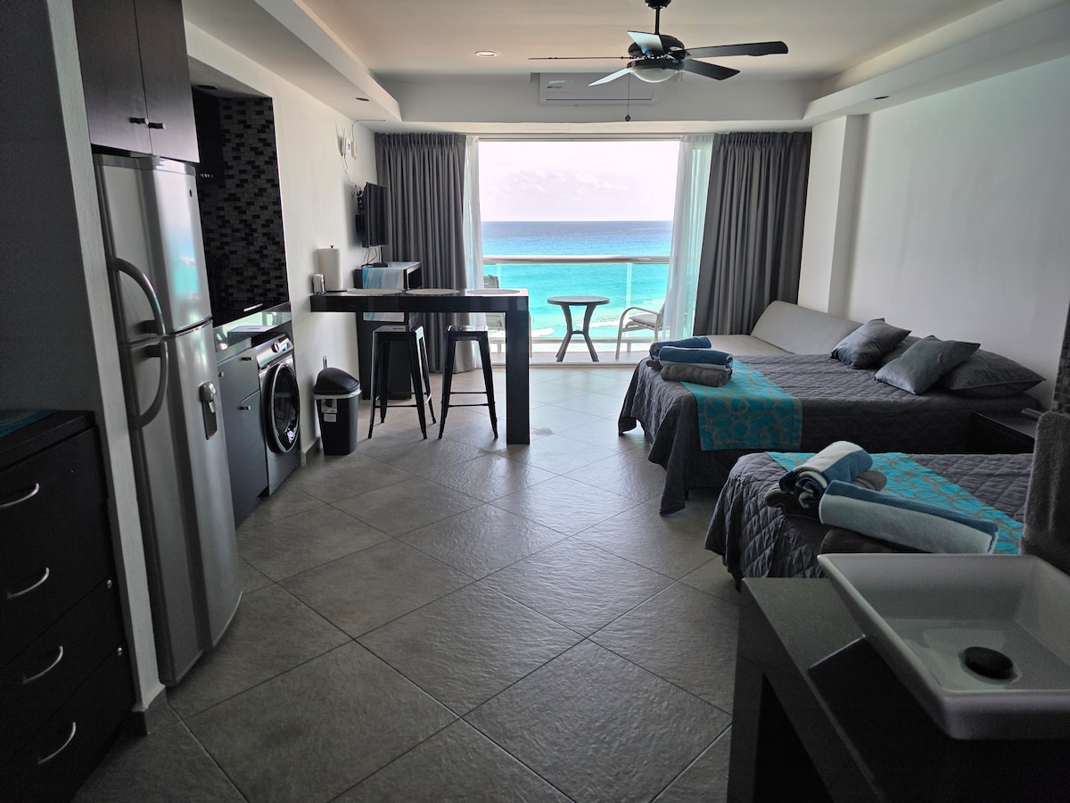 Վերջերս վերանորոգված ստուդիա, որը գտնվում է Կանկուն հյուրանոցային գոտու հենց սրտում, ունի գեղեցիկ տեռաս և օվկիանոսի շնչահեղձ տեսարան դեպի ռեստորաններ և գիշերային կենդանի ժամանց ։ Ստուդիան ունի ժամանակակից երանգ ՝ գեղեցիկ տեռասով, որտեղ կարելի է ժամանակ անցկացնել և վայելել տեսարանն ու օվկիանոսի ձայները մեկ բաժակ սուրճով, գինով կամ պարզապես հանգստանալ ցանցաճոճում: Այն ունի երկու երկտեղանի մահճակալ, բազմոց - մահճակալ, լավ կահավորված խոհանոց և ճաշասեղան: Այն ունի նաև հարթ էկրանով հեռուստացույց և Wi - Fi ծառայություն ։