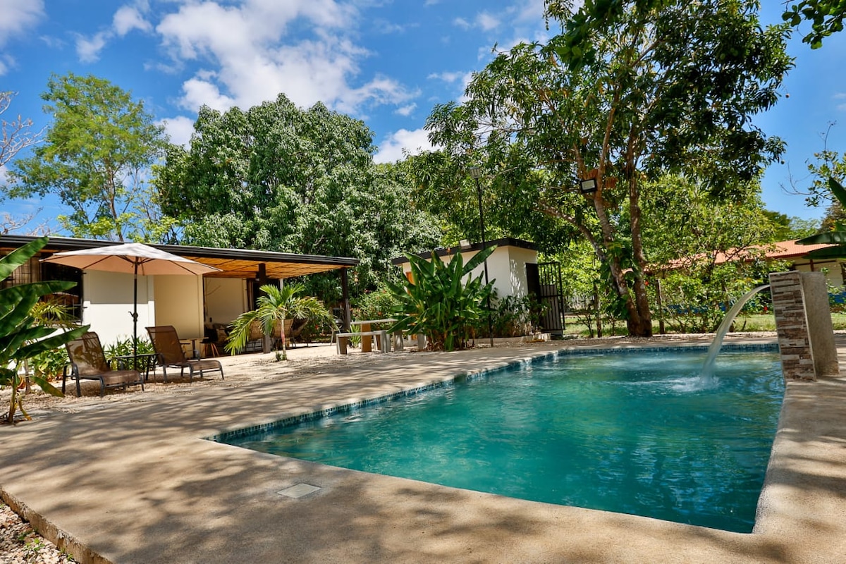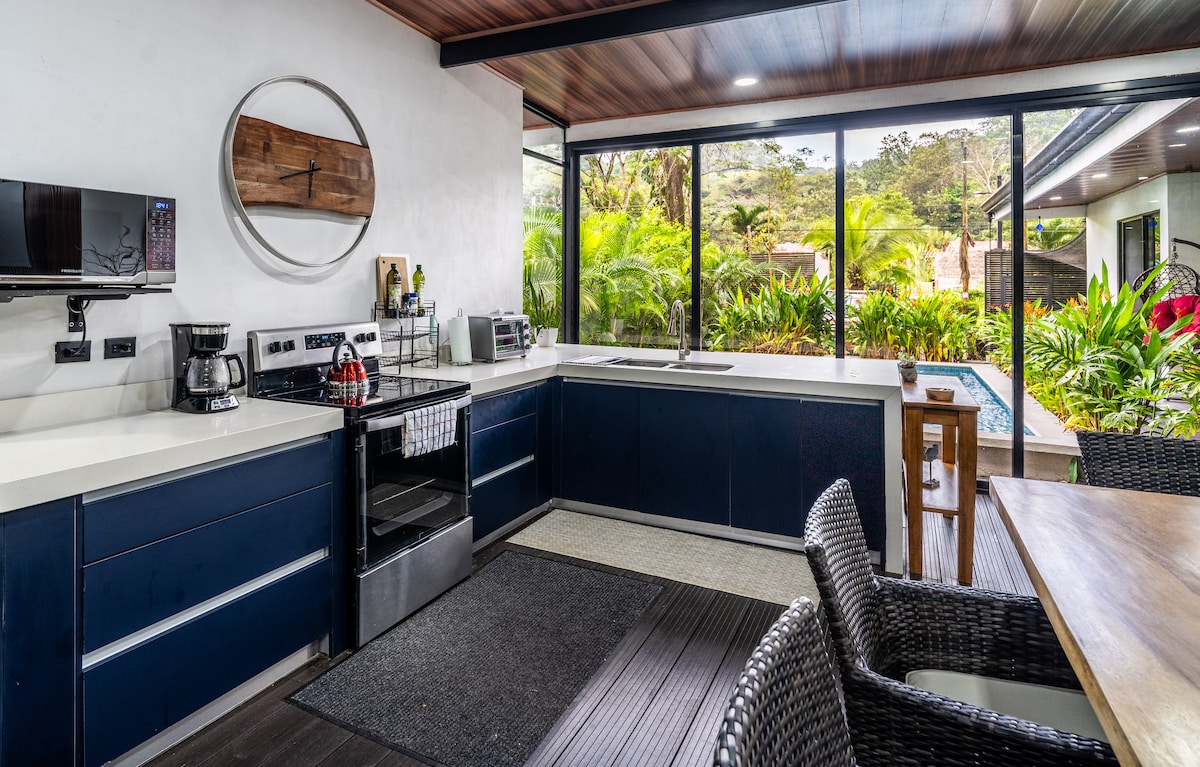 Բացահայտեք Casa Pelícano - ն ՝ բուտիկ ջունգլիներ լողափին մոտ, Պլայա Բեժուկոյից ընդամենը 5 մետր հեռավորության վրա և կարճ գեղատեսիլ ուղևորություն դեպի Պլայաս Ժակո, Հերմոսա, Մանուել Անտոնիո և Մարինա Պեզ Վելա Կուեպոսում: Շրջապատված փարթամ բնությամբ, կապիկներով, մակույկներով և թիթեռներով ՝ այս հարմարավետ հանգստի համար նախատեսված են օդորակիչ, արագ Wi - Fi, ամբողջական խոհանոց և լվացքատուն, 1BR w/ Smart TV, թախտ, 2 տախտակամած, խորոված/կրակարան, ջակուզի/սպա և ապահով կայանատեղի ։ Իդեալական է սերֆինգի, հանգստի կամ հեռավար աշխատանքի համար ։ Խաղաղ, մասնավոր դրախտ ՝ ձեր կատարյալ հանգիստը Կոստա Ռիկայում ։