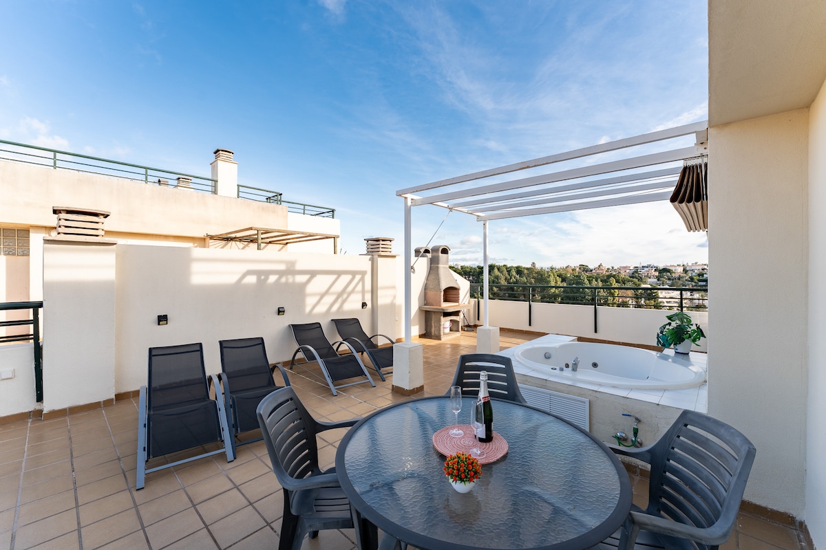 Enjoy a unique experience on the Costa del Sol in this elegant duplex located in Torrequebrada. Recently renovated, it offers modern design, spacious interiors and plenty of natural light. It features a living-dining area with an open-plan kitchen, three double bedrooms with air conditioning and TV, and two bathrooms with shower. The highlight is its spectacular terrace with jacuzzi and barbecue. Includes private parking and access to a communal pool. Ideal for a comfortable and exclusive stay.