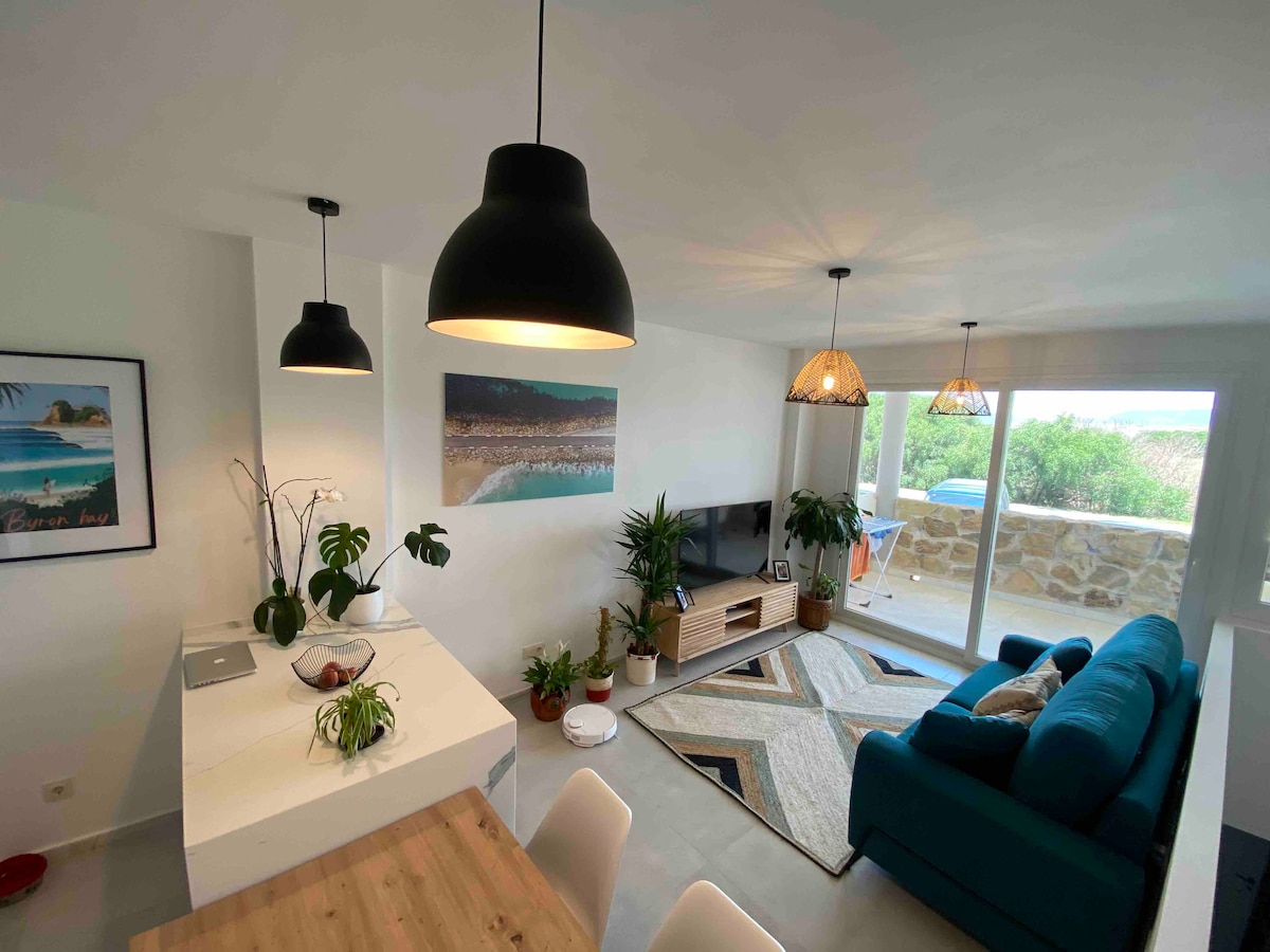 Precioso ático con amplia terraza y encantadoras vistas al mar. Loft de 50 m2 + 10 m2 de terraza con una cama de matrimonio para 2 personas. Está muy cerca de la playa de Los Lances (1 min. caminando) y de los bares y restaurantes del paseo marítimo. También está muy bien situado para visitar el centro (300 m.) o los supermercados y tiendas de Tarifa (200 m.) Perfectamente equipado incluso para vivir una larga temporada (aquí vivo yo durante todo el invierno) Incluye parking privado