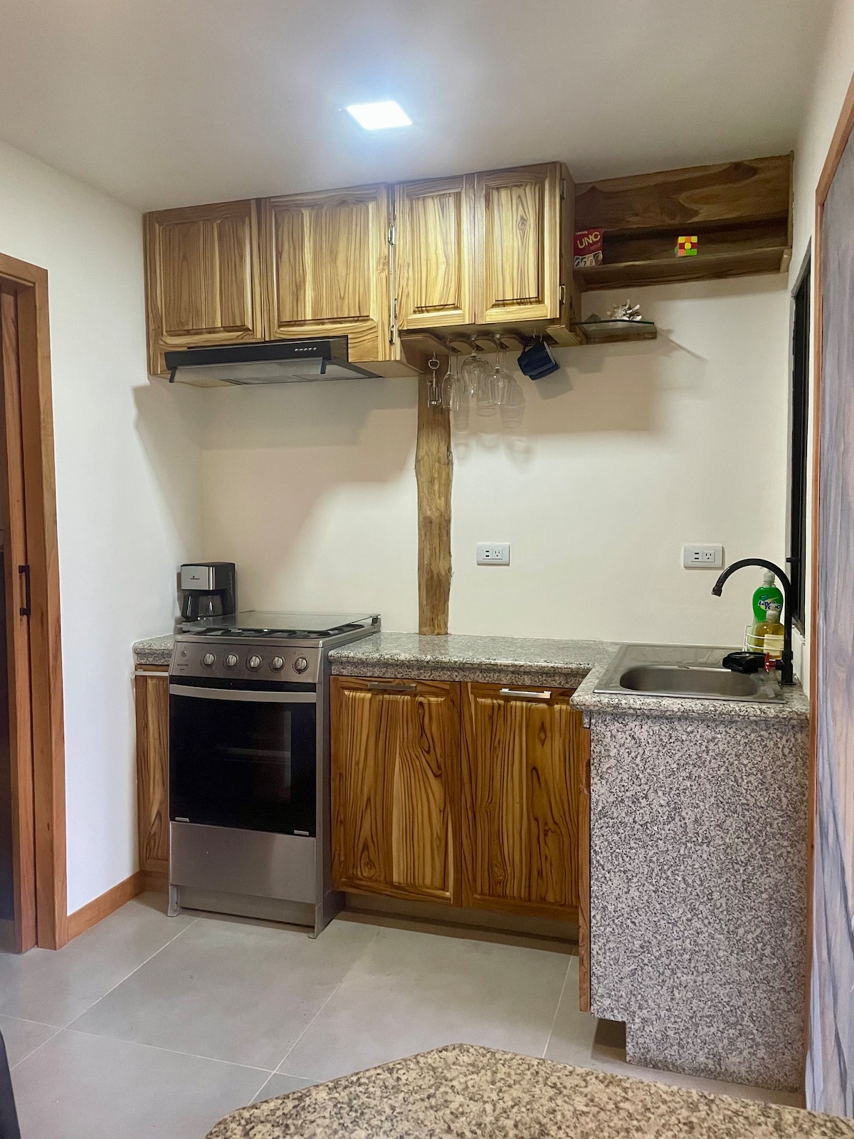 Melt into the relaxing environment of Oloncito at this newly constructed 2nd story home, 1 min walk to the beach. The unit is filled with modern appliances, including 2 AC units, stovetop, fridge/freezer, coffee maker, & microwave. Enjoy refreshing showers in the open, glass structure. The neighborhood is quiet, filled with the sounds of native birds, trotting horses, & iguana calls. The unit is comprised of 2 spacious rooms & a balcony. There are two workstations. Internet is fast & reliable.
