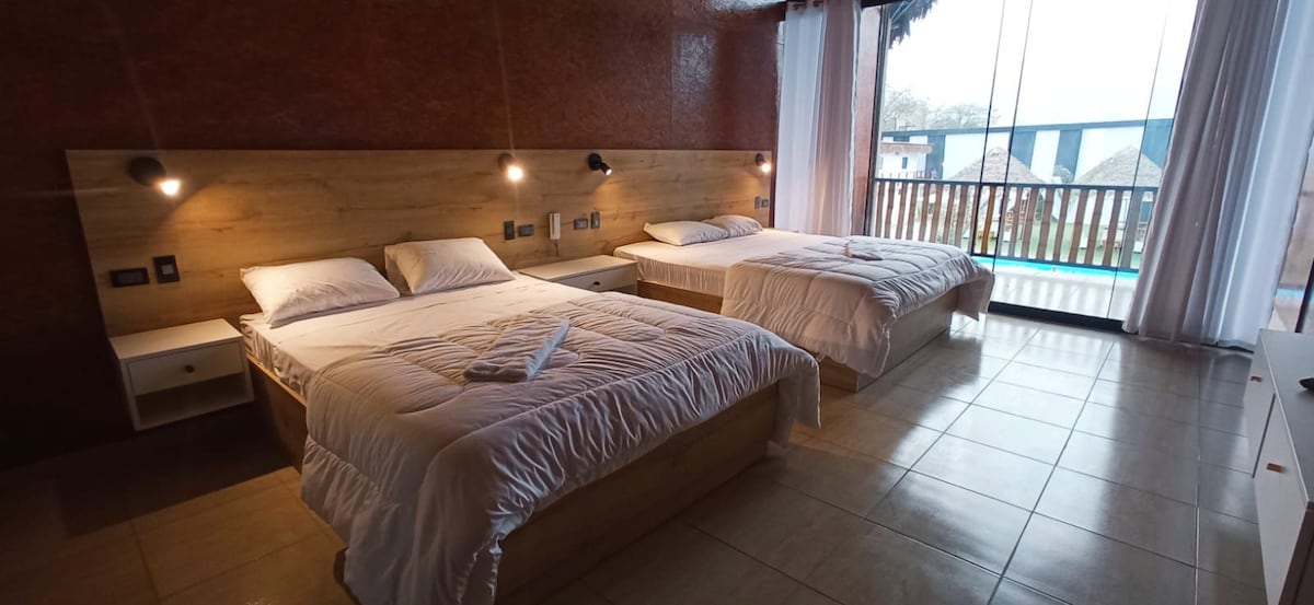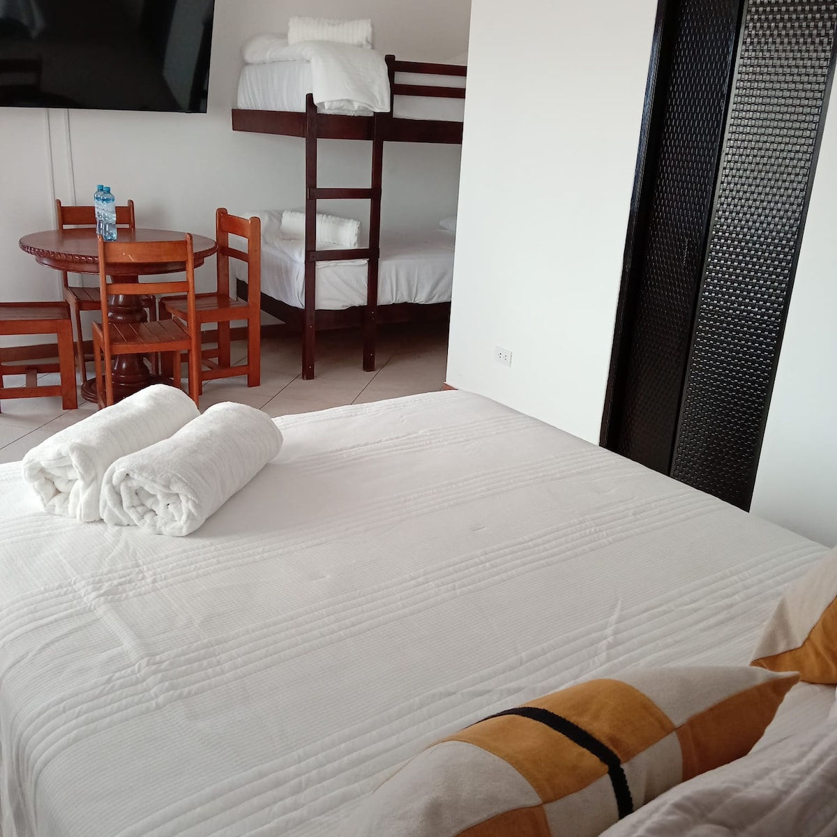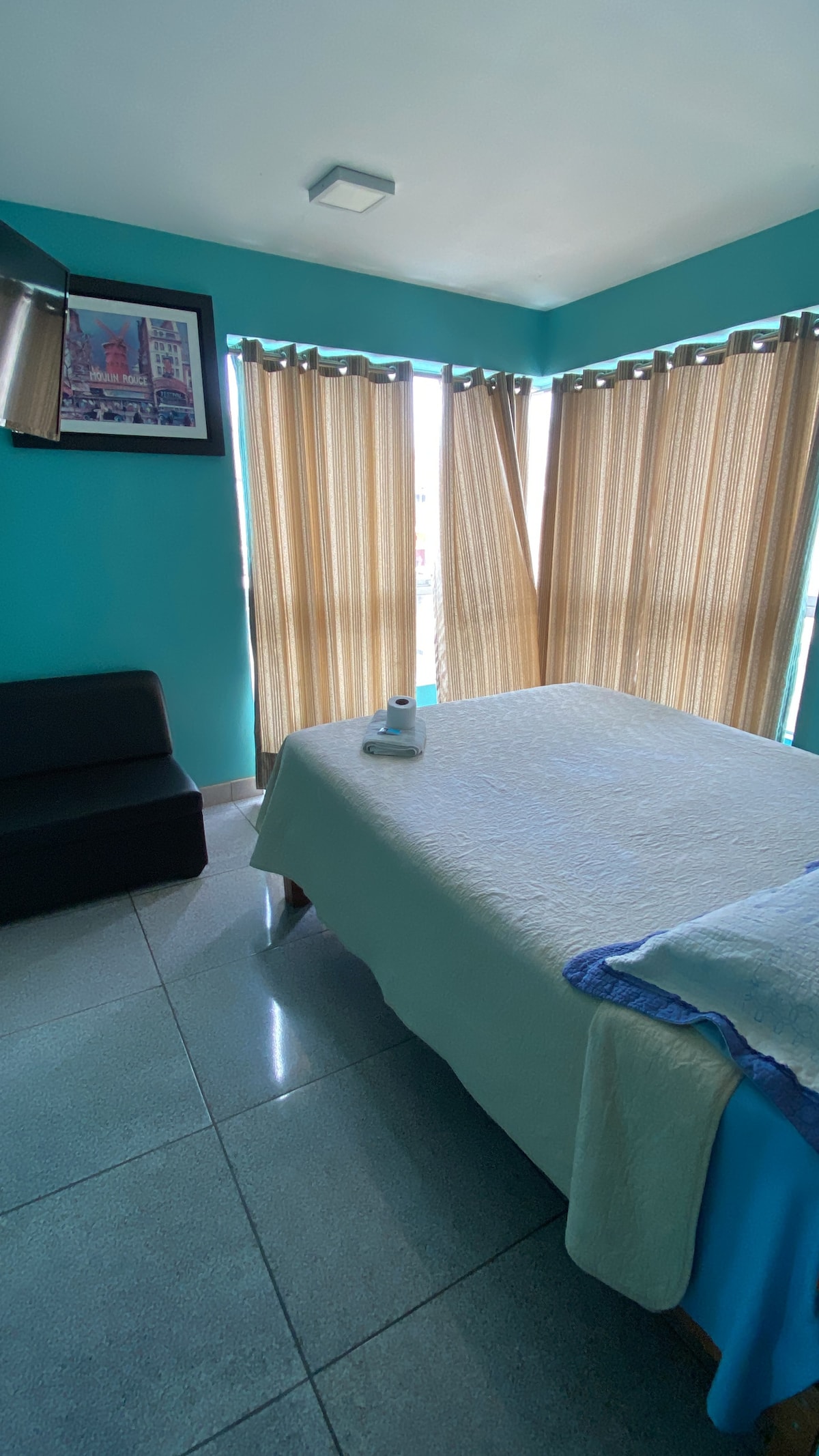 Habitación Matrimonial cama de 2 plazas, baño propio con ducha agua caliente, jabón y shampoo, ubicada en el segundo piso vista a la ciudad. Smart Tv 55" Samsung 4K Crystal. Toallas de cuerpo, mano y pies, cortinas de tul y blackout, almohadas, almohadones y cojines en la cama. Wifi alta velocidad en todo el Hotel.