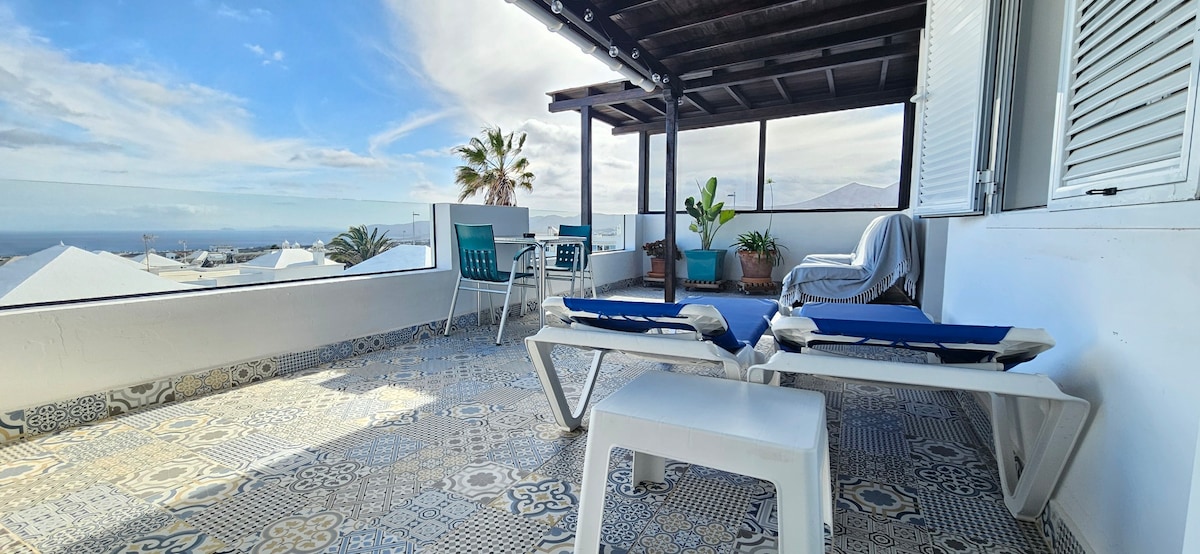Stay in one of two charming 80 sq m modern hippie apartments with a unique view of Timanfaya National Park and its volcanoes. The apartment features a fully equipped kitchen, a living room with panoramic sliding doors and a sofa bed, HDTV, fiber optic internet, and a bedroom with a Canarian-style en-suite bathroom. Relax on your private terrace, dip your toes in the César Manrique saltwater pool, enjoy the endless vistas, and marvel at magical sunsets. 🩵