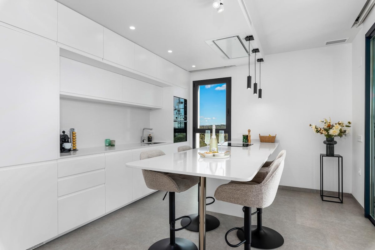 Գոլֆ, լողափ, բարեր, ռեստորաններ, մեծ քաղաք կամ հանգիստ հանգիստ ։ Բերեք ձեր ընտանիքին կամ ընկերներին և վայելեք այս նրբաճաշակ տունը ։ Բոլորովին նոր շքեղ վիլլան ունի մի շարք հարմարություններ ։ Առանձին այգի և լողավազանի տարածք ՝ տարբեր նստատեղերով, արևապաշտպան մահճակալներով և մանղալով, որը կատարյալ է դրսում հանգստանալու համար ։ Դուք կարող եք շրջել երեք հարկերի վրայով ՝ տանիքի մեծ կտուրով, որտեղից կարող եք վայելել քաղաքի և դեպի ծով բացվող տեսարանը: Օդորակում և արագ ինտերնետ ։ Մենք առաջարկում ենք 3 երկտեղանի մահճակալ 160*200 և 4 մեկտեղանի մահճակալներ 90*200: