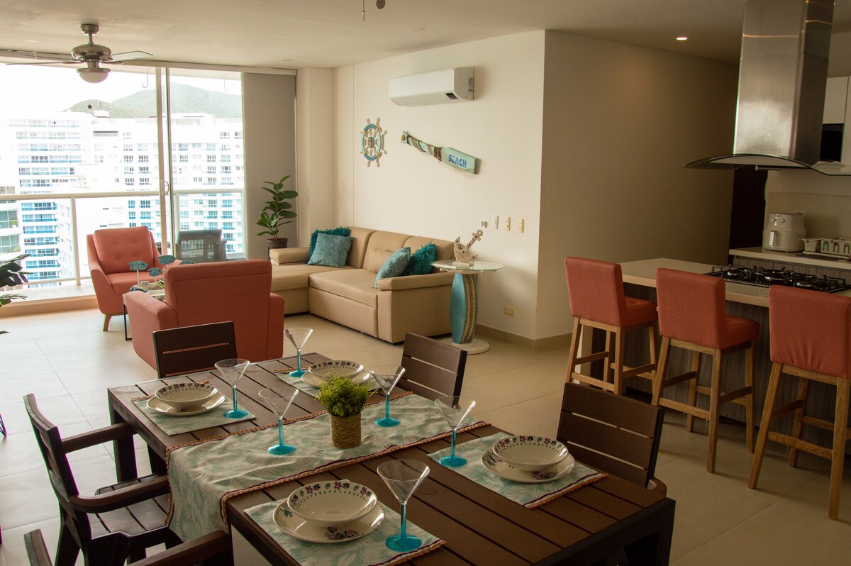 Տպավորիչ բոլորովին նոր ժամանակակից բնակարան 17 - րդ հարկում ՝ ծովի տեսարանով և դեպի լողափ ուղիղ մուտքով ։ Հանգիստ, հանգստանալու և (կամ) աշխատելու համար հաճելի տարածք: 10 րոպե դեպի միջազգային օդանավակայան և Սանտա Մարտայի պատմական կենտրոն, որը մոտ է ռեստորանների, բարերի, առևտրի կենտրոնների և դեղատների տարածքին: Մեկ ժամից էլ քիչ հեռավորության վրա գտնվող Թայրոնա ազգային պարկից, Տագանգա, Մինկա ։ Բնակարանն ունի մեծ պատշգամբ, որտեղ կարող եք վայելել Կոլումբիայի լավագույն մայրամուտը ։