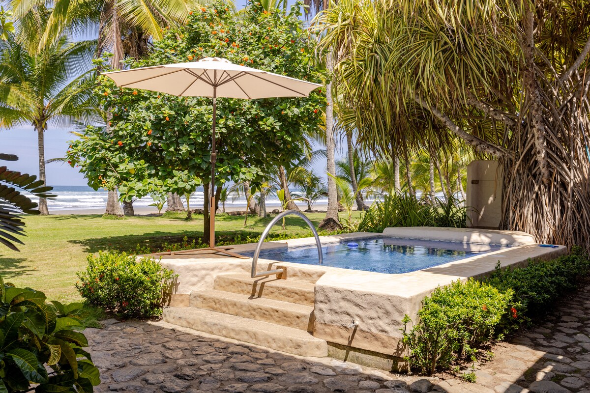 BEACH FRONT! AC everywhere. 2 bdr + Pool! Cutest little beach house on a gorgeous palm tree lawn, FRONT ROW beach Playa San Miguel. Beautiful tropical views from every window & deck. House 110m2 (1200ft), 2 stories. Downstairs living room, kitchen, toilet. Upstairs 1 bdr wood floors, king bed, desk, closet + bathroom. To side of main house is 2nd bdr, queen bed, desk + full bath.