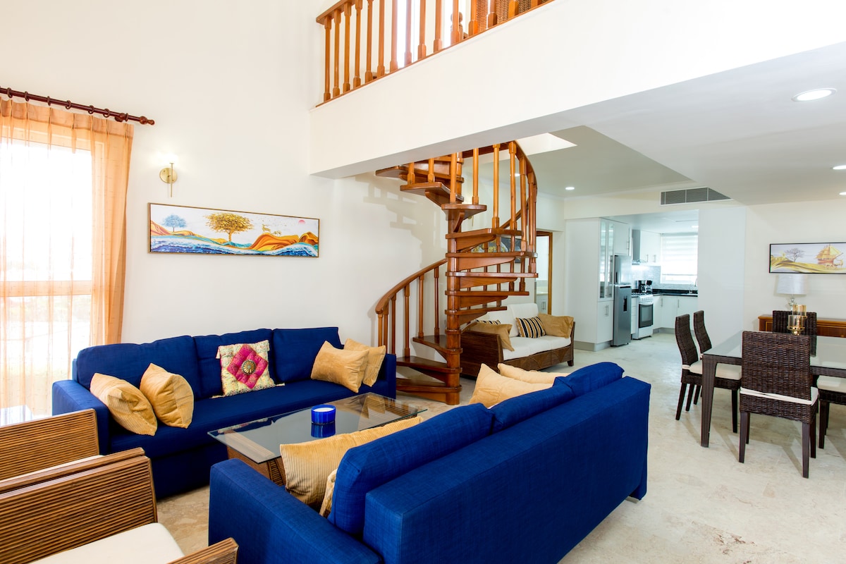 Escápate a esta villa premium en Doral Village, a 1 minuto de Downtown Punta Cana. Cuenta con 3 dormitorios, 3 baños completos, diseño moderno y terraza privada con picuzzi. Disfruta estación de bienvenida con café dominicano, leche y agua fría. Incluye aceite de oliva española, tés, chocolates y doble almohada por huésped. Amenities premium: gel Dr Teal’s y champú y acondicionador L’Oréal. Ubicación ideal cerca de restaurantes, supermercados y cines.