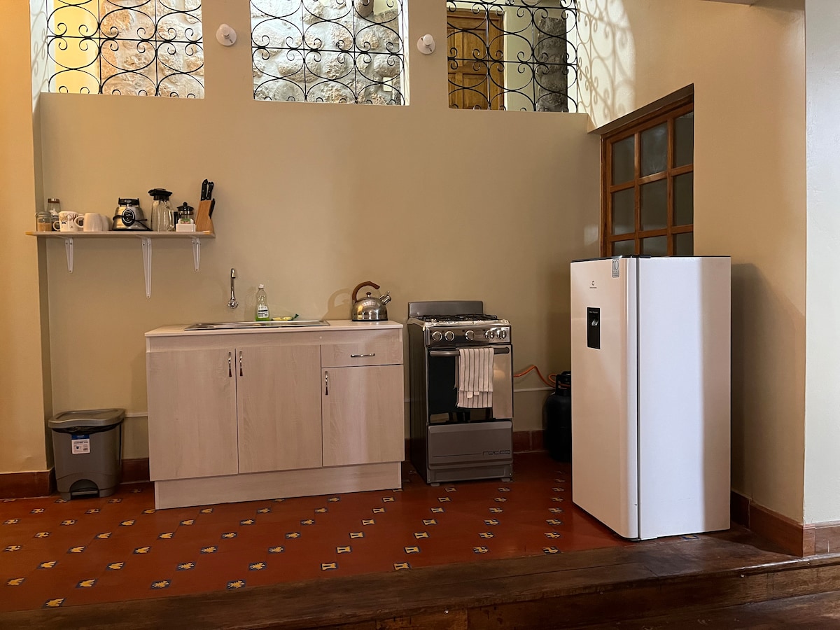Կուսկոյի Պլազա դե Արմասից երեք թաղամաս հեռավորության վրա, Սան Բլասի ավանդական թաղամասում է գտնվում Լիովին առանձին մինի բնակարան ՝ խոհանոցով, ճաշասենյակով, լոգասենյակով, ննջասենյակով, բուխարիով, պատուհանով, neflix - ով, Wi - Fi - ով (օպտիկամանրաթելային) և տան այգում գտնվող տեռասով ։ Այն ունի շուրջօրյա ծառայություններ և վայելում է անտառի խաղաղությունը, որը գտնվում է գլխավոր ննջասենյակի հետևում: Այն ավանդական գաղութային տիպի տան մի մասն է ՝ Կասիտա Ազուլ - դե ադրբե, սպիտակ պատեր ՝ կապույտ դռներով և պատշգամբներով