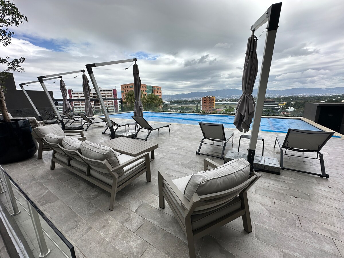 Apartamento modificado de 2 a 1 habitación para ofrecer grandes ambientes y una vista estupenda a la ciudad y los volcanes. Sus más de 85 m2 se conjugan con un equipamiento y decoración de primer nivel. Contamos con piscina climatizada a 31 C, gimnasio equipado, areas sociales en el piso 25 como un Fire Pit; asi como supermercado, salon de belleza y banco en el lobby. Ubicado en la zona hotelera de la ciudad o Zona Viva a pasos de los mejores hospitales, restaurantes y centro comerciales
