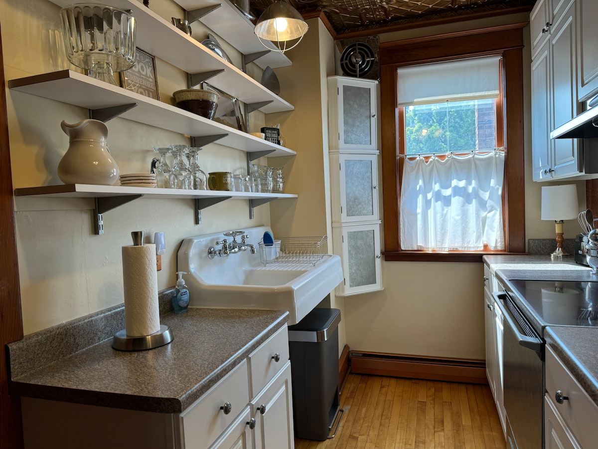 Discover this one-of-a-kind, shabby-chic second-floor apartment in the heart of Downtown Kenosha — just steps from coffee shops, restaurants, museums, and the shores of Lake Michigan. Ideal for travelers who want everything within walking distance. Relax and unwind on the spacious, completely private back deck — your own hidden oasis tucked among treetops and historic neighborhood buildings. Perfect for stays up to four guests. Please note: This property is not suitable for young children.