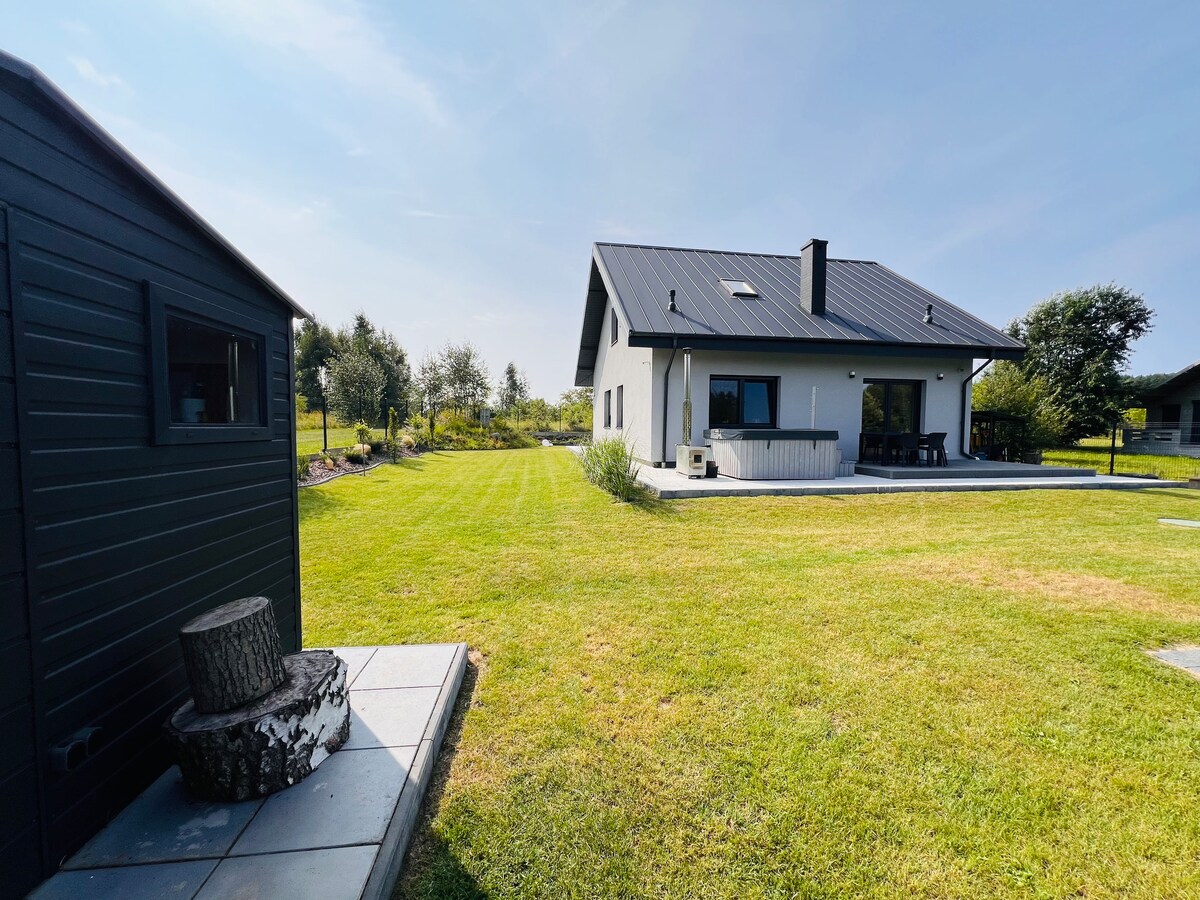The House ‚GM Lodge’ is a place of awakening🌿 A place that reflects its history, surroundings, values, and intentions in ways both subtle and grand. You‘ve got a large living room with a cozy fireplace 🔥, 2 bedrooms, relaxing bathroom with a private big sauna for your stay🏡 and surrounded forests 🌳 🌲 GM Lodge is created from an old barn in 2020. We stand for the nature🌾🌱 Welcome to wonder🙌 Diese stilvolle Unterkunft eignet sich perfekt für Gruppenreisen max 4 Personen