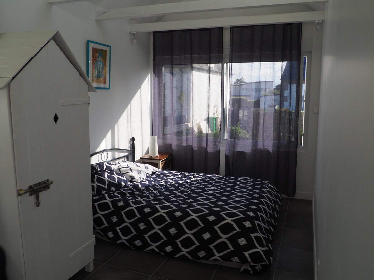 Studio (de 35 m2 environs) sous les toits pour 2 personnes. Entrée par la maison contemporaine , Mais une fois dans votre studio vous êtes totalement indépendants. Idéal pour un couple ou deux amis désireux de partir à la journée visiter notre pays d'Iroise . Une chambre séparée du coin salon (avec un lit retractable, en plus si vous avez le souhait de dormir séparément) Salle de bain privative et WC Petit coin table /chaise micro-ondes pour repas d appoint et petit déjeuner . A bientôt, Hélène