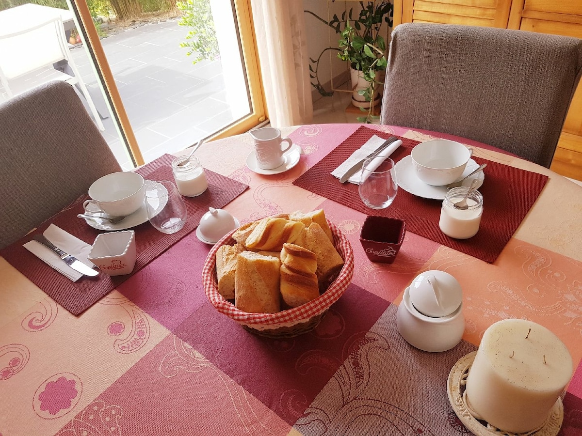 Առանձնատուն, որը գտնվում է հանգիստ տարածքում ։ Ննջասենյակը վերևից է, ցնցուղի սենյակը և կից զուգարանը, ձեր գաղտնիությունը երաշխավորվում է: Ցանկության դեպքում նախաճաշերը կարող են մատուցվել առաջին հարկում գտնվող ճաշասենյակում կամ ձմեռային այգում ՝ կախված ջերմաստիճանից:(7 հյուր) Ձեր տրանսպորտային միջոցը կարող է կայանել տարածքում ՝ տաղավարի դիմաց ։ Կից ավտոտնակը թույլ է տալիս տեղադրել հեծանիվներ կամ մոտոցիկլետներ ՝ անվտանգ և ապահով ։