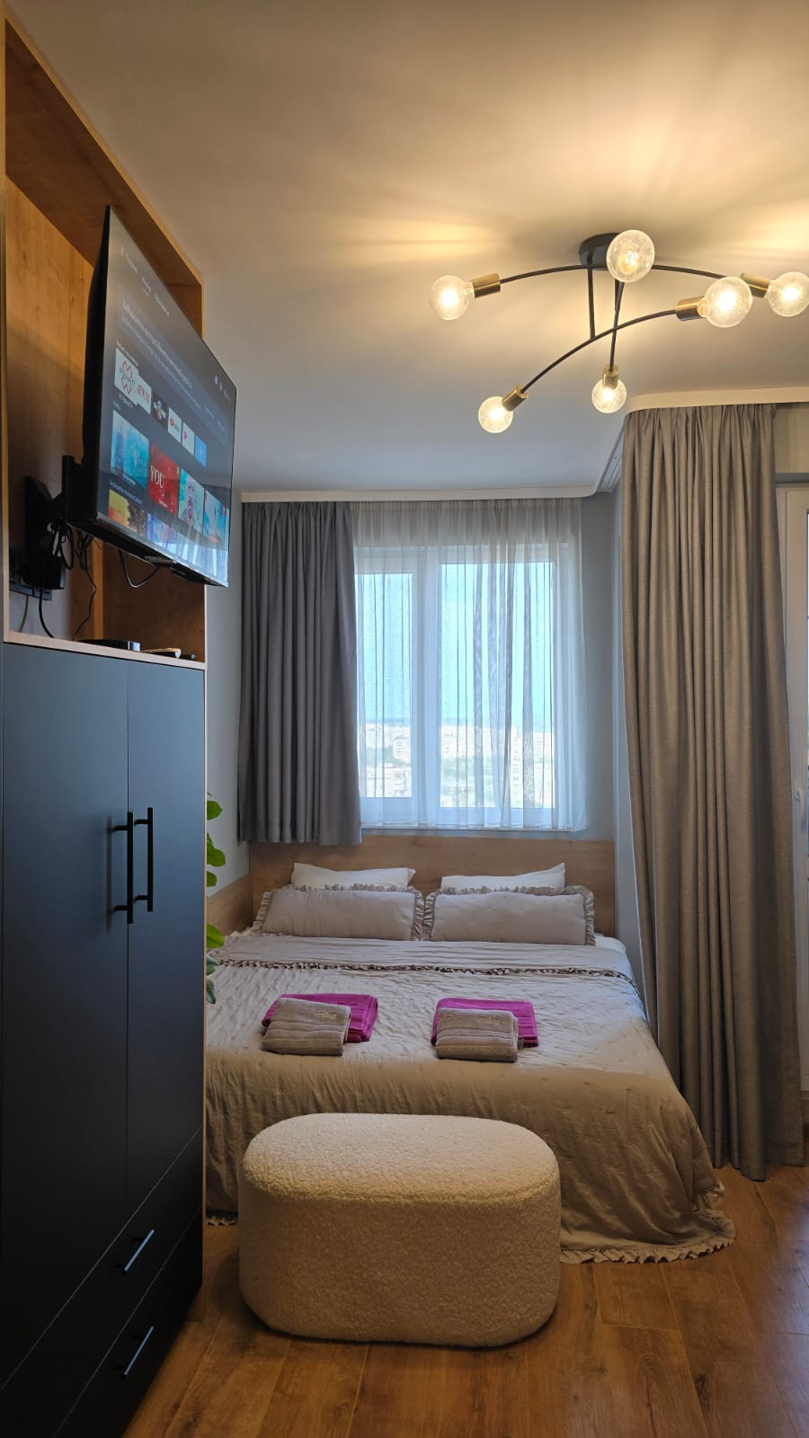 Private studio on the 15th floor with an impressive panoramic view of the Maritsa River, the Rhodope Mountains, and the Plovdiv Hills. Just a 10-minute walk to the Old Town and Kapana. Cozy, bright, and functionally furnished—ideal for a peaceful stay in the heart of Plovdiv. Access to the studio is through a shared corridor; the building is a 1980 EPC construction and has two elevators.