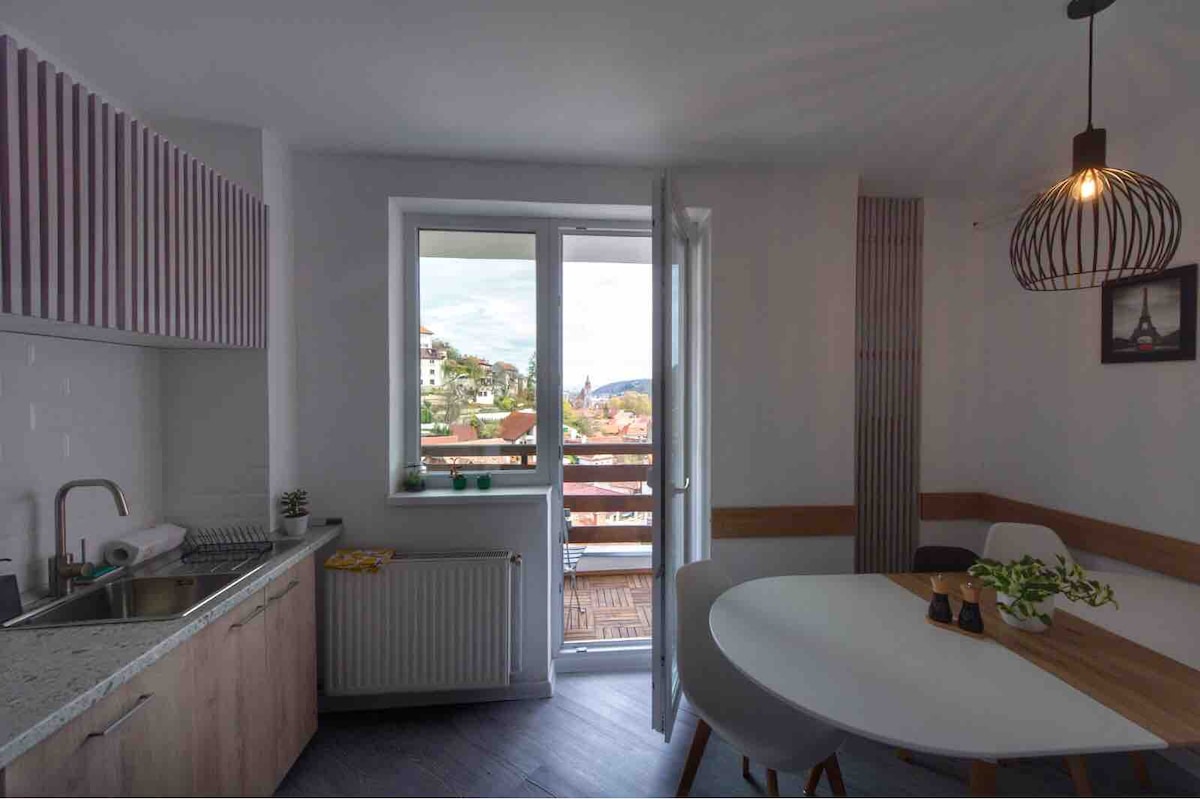 Բարի գալուստ մեր հարմարավետ և ժամանակակից Airbnb բնակարան Բրազովում, որը գտնվում է քաղաքի կենտրոնից 1 կմ - ից պակաս հեռավորության վրա ։ Մեր բնակարանն առաջարկում է հիասքանչ համայնապատկեր դեպի քաղաք և փառահեղ Տամպա լեռը ։ Մեր բնակարանն ունի նորաոճ և կահավորված խոհանոց, ընդարձակ հյուրասենյակ, հարմարավետ ննջասենյակ և ժամանակակից լոգասենյակ ։ Մեր բնակարանի առավելություններից մեկը մասնավոր ավտոկայանատեղին է, որը հատկապես արժեքավոր է Բրաշովի նման քաղաքում: