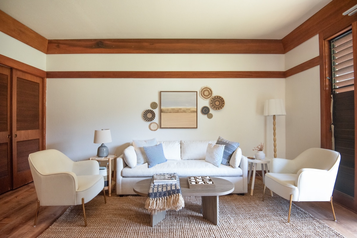 Վերափոխված առաջին հարկ, անկյունային հարկաբաժին բացառիկ շենք 11 - ում: Քայլեր լողափից ։ Ամբողջ տունը A/C (երկակի տրոհված հյուրասենյակում և ննջասենյակում ՝ պատուհանի հարկաբաժնում )։ Նոր կալքական մահճակալ, 150 -179 սմ մահճակալ և մինի երկտեղանի մահճակալ հյուրասենյակում ։ Քնում է մինչև 5 հոգի ։ Գերարագ Wi - Fi ։ Մասնավոր լանայ ՝ դեպի ընդարձակ այգիներ և Twin Bridges ։ Նոր հյուրասենյակ և ճաշասենյակի կահույք: 65" Smart TV. Բլոկը մատակարարվում է լրացուցիչ հարմարություններով, առաջարկվող փորձառություններով և կղզու շուրջ դայակի խորհուրդներով ՝ ֆանտաստիկ և անմոռանալի հանգիստ առաջարկելու համար ։