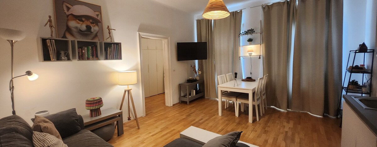 Երկու առանձնացված ննջասենյակներում կա մինչև 4 հյուրի համար նախատեսված տարածք ։ Բնակարանը գտնվում է 1800 - ականների շենքում, որը յուրահատուկ խառնուրդ է կրում Alt - Wien (Հին Վիեննա) և 70 - ականների կահույքի ոճի միջև ։ Սրճարաններով և ռեստորաններով շրջապատված բնակարանը շատ լավ կապված է այլ հիփ տարածքների հետ. 5 - ից 10 րոպեում տրամվայով կարող եք հասնել 1 - ին թաղամաս մտնող Schottentor կայարան կամ 7 - րդ և 8 - րդ թաղամասեր ՝ Burggasse - ի և Neubeugasse - ի հետ (շատ խորհուրդ տրվող երիտասարդ թաղամասեր ՝ գեղեցիկ խանութներով և բարերով)