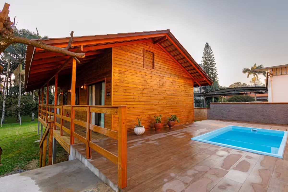 Հանգստացեք այս հանգիստ, ոճային տարածքում ։ Շալե ՝ Ալեքսայով, ջակուզիով և ամբողջական կառուցվածքով, որը հիանալի ընկերակցությամբ կարող է վայելել այցը Բրազիլիայի ամենաթարմ գերմանական քաղաքում ։ Տարածքն առաջարկում է նաև տախտակամած ՝ բազկաթոռներով, պտղատու այգով, բնության արահետով, բանջարեղենի այգիով, գերհագեցած խոհանոցով, տաք/սառը օդորակիչով, հեռուստացույց ՝ ամբողջական ծրագրավորմամբ, Netflix - ով, գերարագ Wi - Fi ցանցով և շատ ավելին ։
