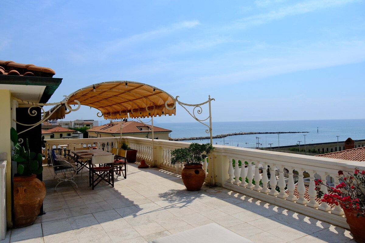 Splendido attico nel centro di San Vincenzo, a pochi passi dal porto e dalla via principale della città. Dispone di un ampio terrazzo di oltre 130 m^2 sopra il quale potrete prendere il sole e fare splendidi aperitivi al tramonto. L’abitazione dispone di: una camera da letto matrimoniale, uno spazioso bagno con doccia in muratura di travertino e un soggiorno con angolo cottura e 2 divani letto per ulteriori 3 ospiti. Il grill all'esterno della casa non è più presente sul terrazzo.