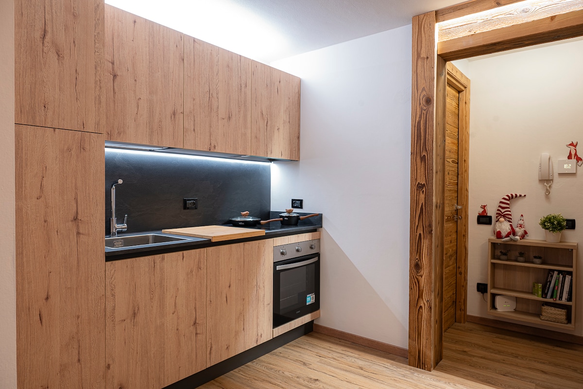 Prestigious property: the ideal solution for unforgettable family holidays. This splendid accommodation, carefully furnished with attention to every detail, seamlessly combines modern style with alpine elegance. The warmth of wood harmonizes perfectly with the cool tones of steel and the shades of gray, creating a welcoming atmosphere rich in style and taste. The apartment features a spacious living area with a fireplace, Smart TV, and a sofa bed that can accommodate two guests.